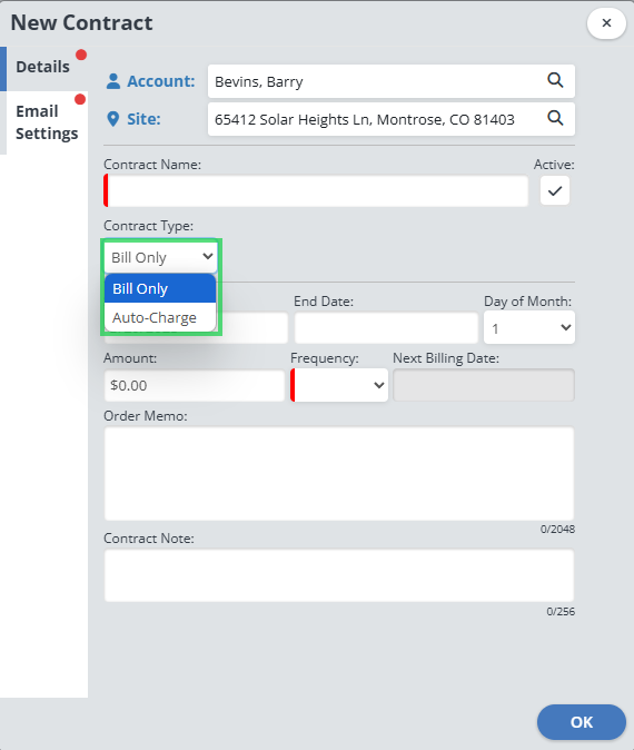 Contract Type: Select if this contract type is "Bill Only" or "Auto-Charge". NOTE: Auto-Charge is only available with SM Pay