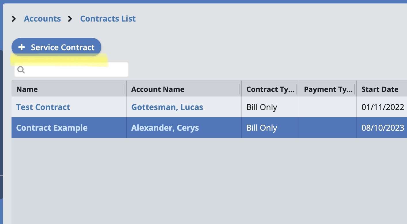 Here you can view your list of contracts. You can create a new contract by clicking on the “+ Service Contract” button.