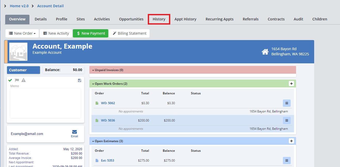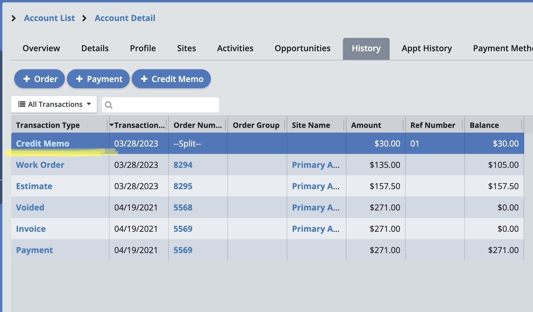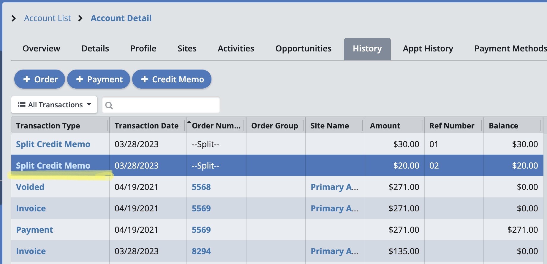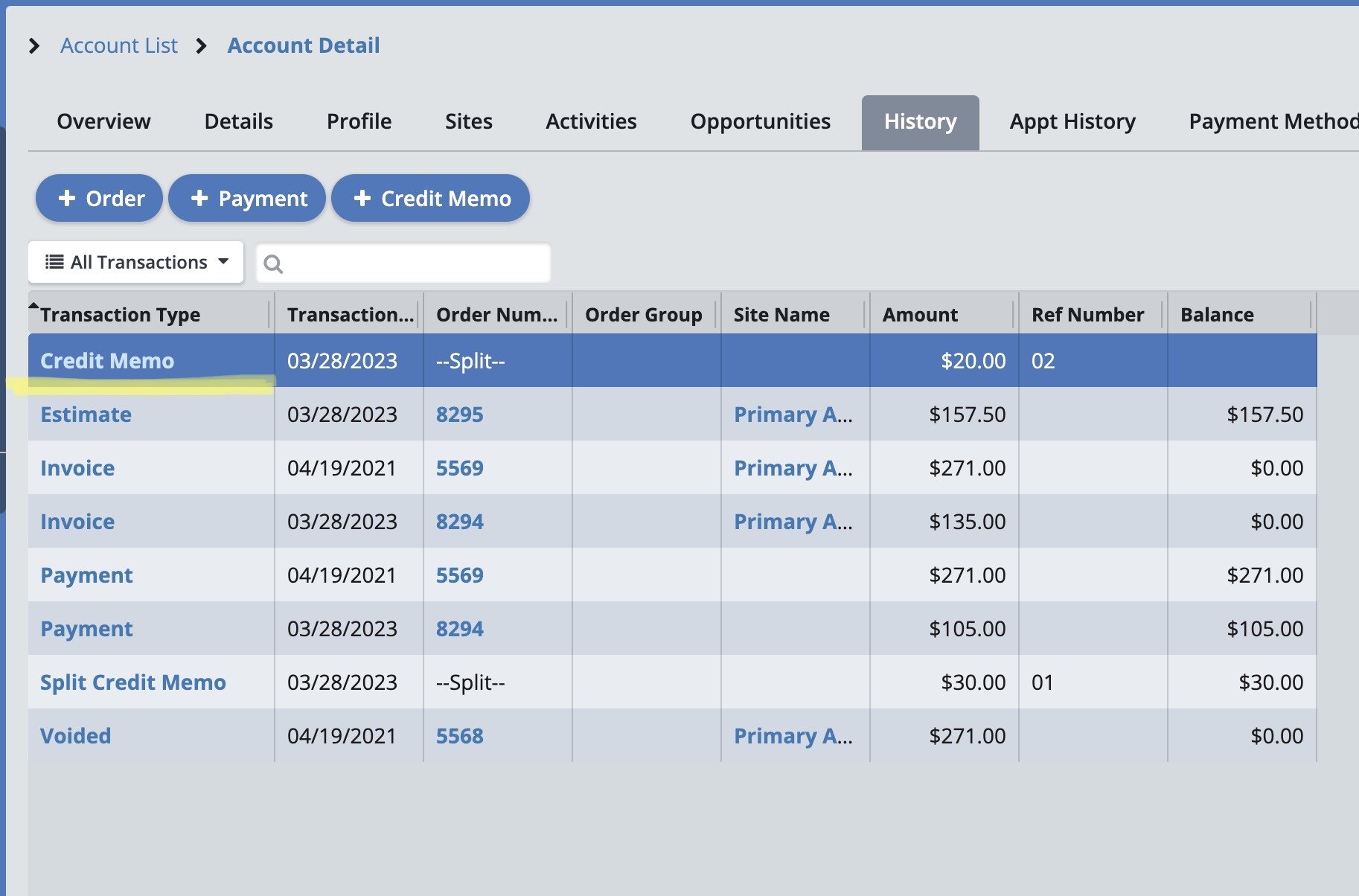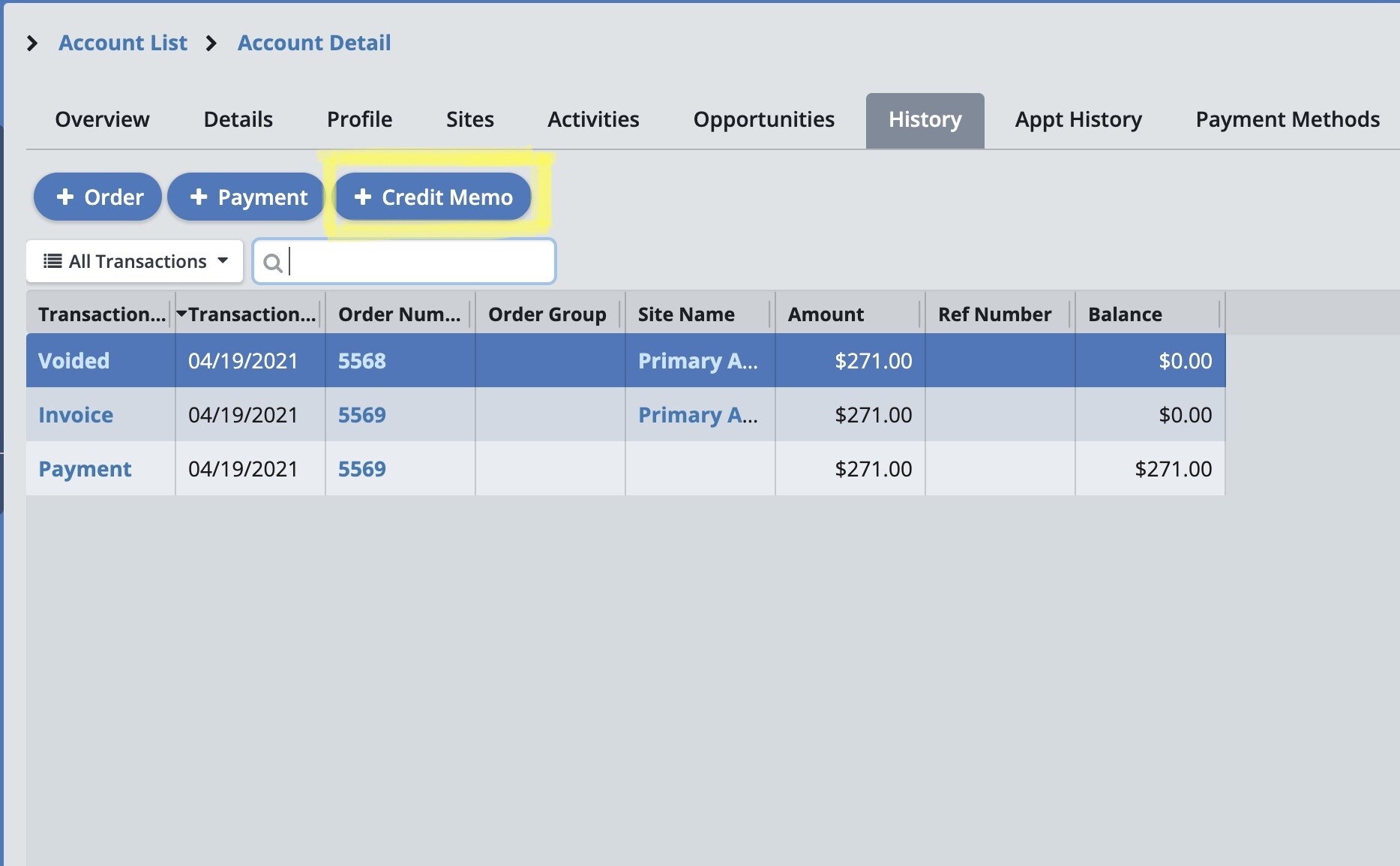 To create a Credit Memo, open the account for the client in question. Click on the “History” tab. This opens a list of all orders and payments on this account.
