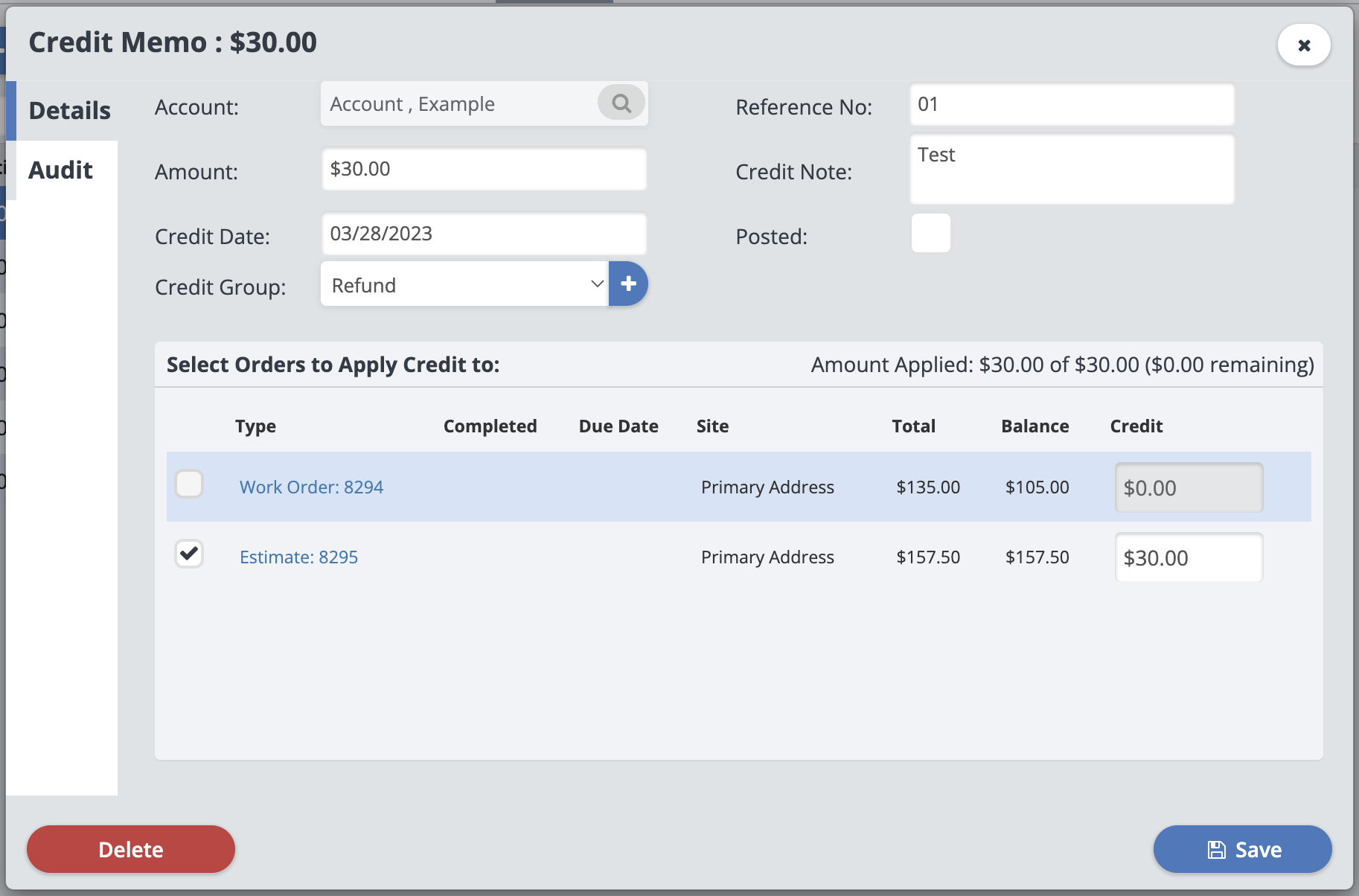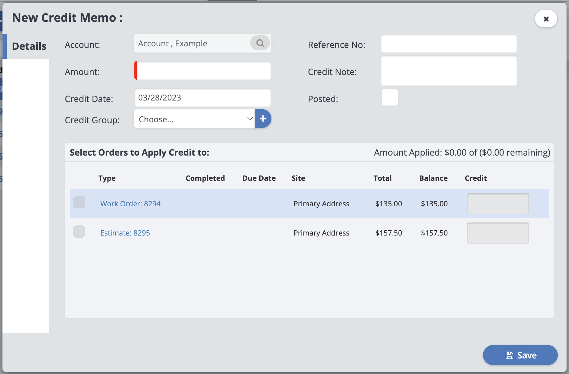 You can apply this credit to an order now by selecting the orders it should be applied to. Otherwise, click “Save” and the credit memo will be created in the account.