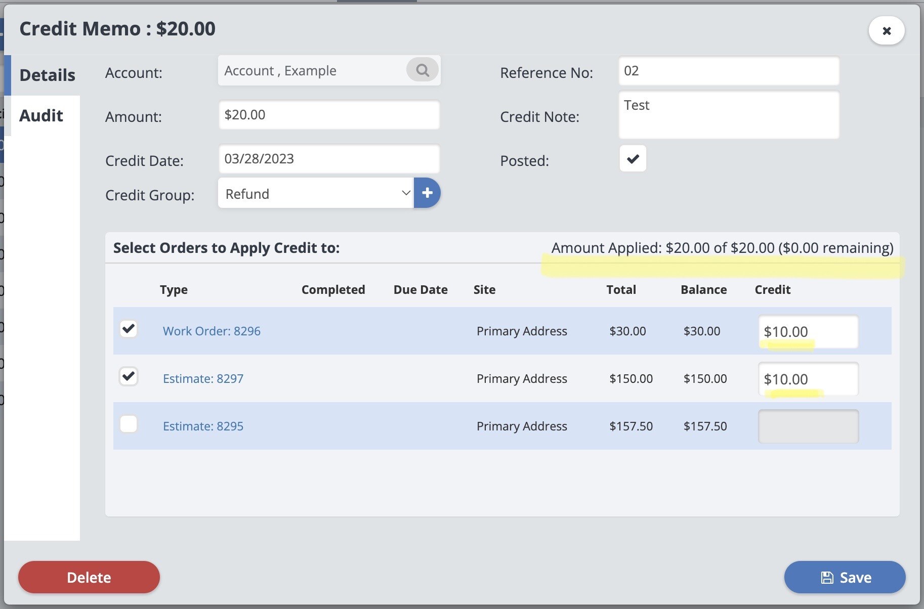 In the Credit Memo details window, select all the orders you wish to apply the Credit Memo to and adjust how much of this credit is applied to each order.