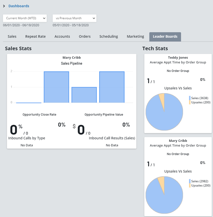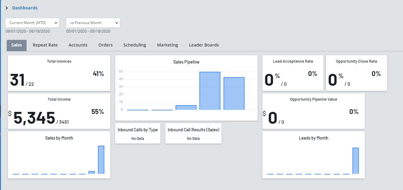 Sales Pipeline: A bar graph which shows what steps your orders are at. The Y-Axis is thenumber of orders, and the X-Axis is the order type (Leads, Opportunities, Estimates, Work Orders, Invoices)