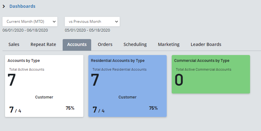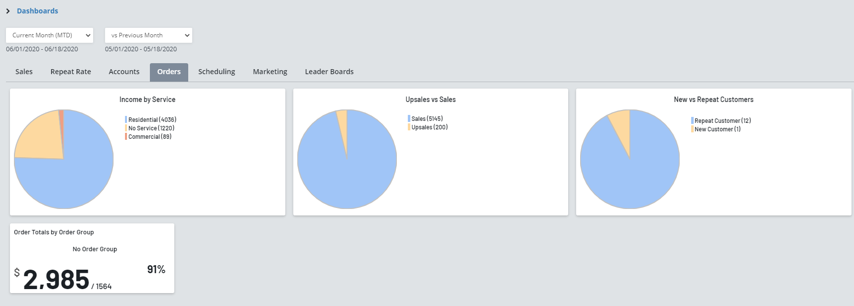 Income by Service: A pie chart which is divided up by your invoice from Residential Services, Commercial Services, or No Service.