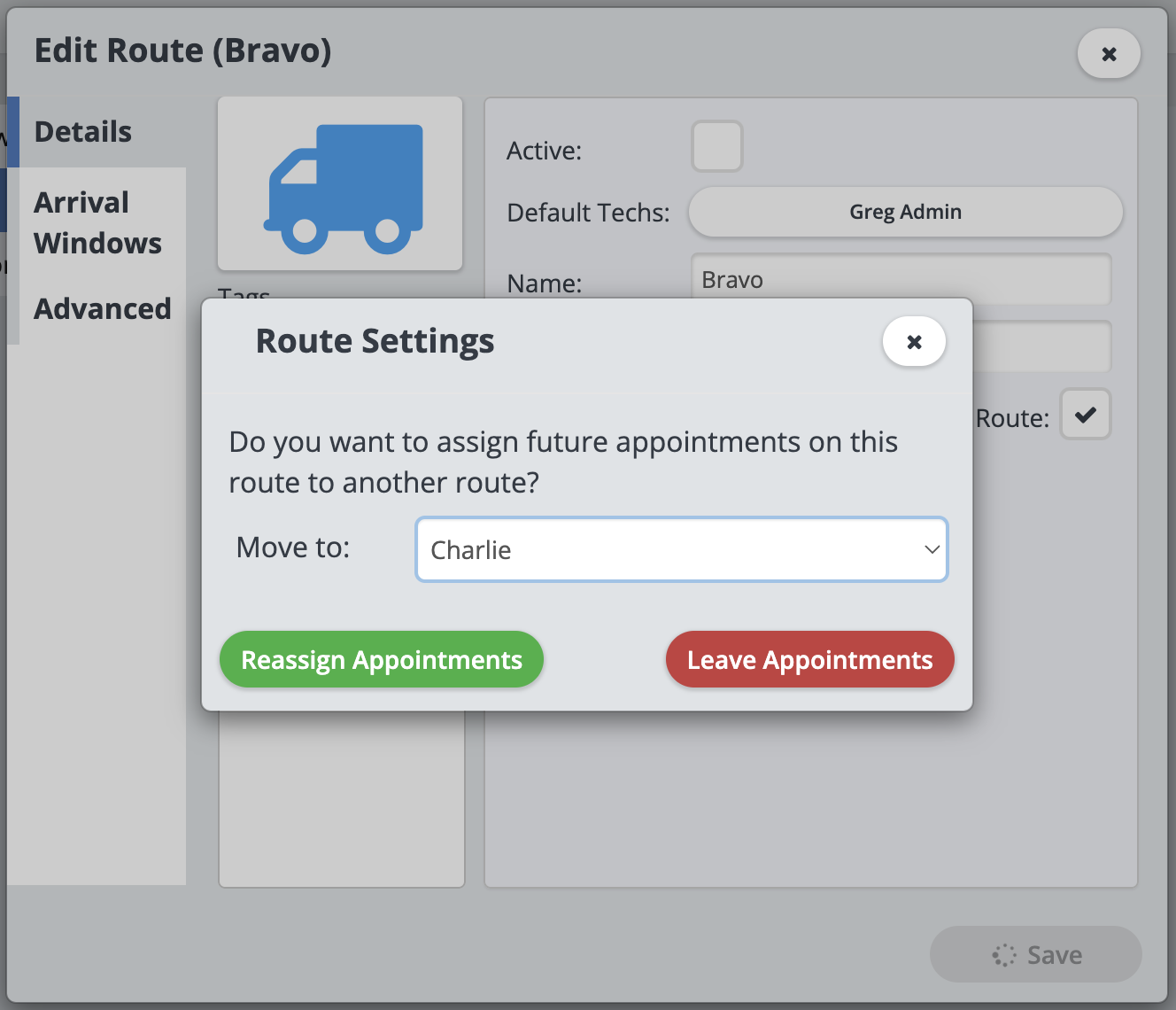 A window will appear asking you to select a route these appointments should be reassigned to. Find the route that you want these appointments to be moved to and click “Reassign Appointments”, or click “Leave Appointments” to not reassign the appointments (Those appointments will be removed from the schedule).