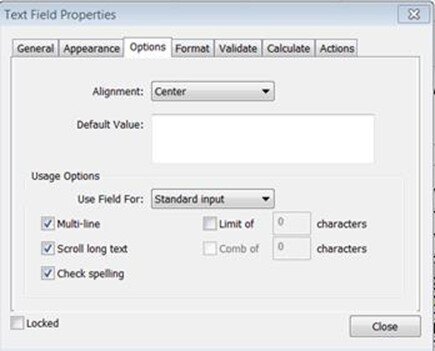 Options – Allows you to change the alignment and wrap options of the text. **If ‘Multi-line’ is checked, the text will wrap in the field.