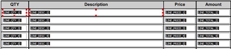 Line items are a bit more complicated as you will need to indicate each line and its corresponding Item Name, Description, Quantity, Price and Total. Here is how to accomplish this: