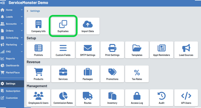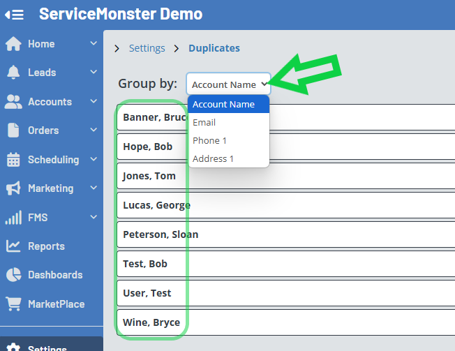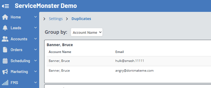 Within ServiceMonster, duplicates are two or more accounts that are likely the same client. Because ServiceMonster is built so you can have multiple site addresses attached to one account, we recommend having only one account for each client.