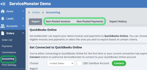 After running QuickBooks Web connector QuickBooks sometimes indicates “Some items are rejected by QuickBooks”. To see the errors, from ServiceMonster go to Orders > Accounting and click the following tabs: