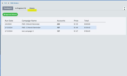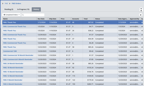 Your order history list shows the name, run date, ship date, price, number of accounts reached, total cost, status, and approval information organized by columns. These columns are customizable if you wish to rearrange the order.