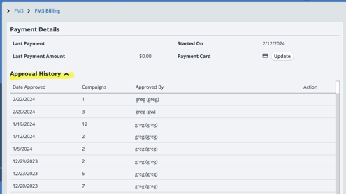 Open up the Approval History to view all your approved campaign orders, the date of approval, and who approved each order.