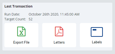 The campaign page will update. In the lower left-hand corner of the screen where it says "Last Transaction" boxes will appear depending on what you choose for the campaign to create. There's are links to download the Explore File (A spreadsheet of your client's information), Letters (A PDF of the generated letters for each client), Labels (A PDF of mail labels).