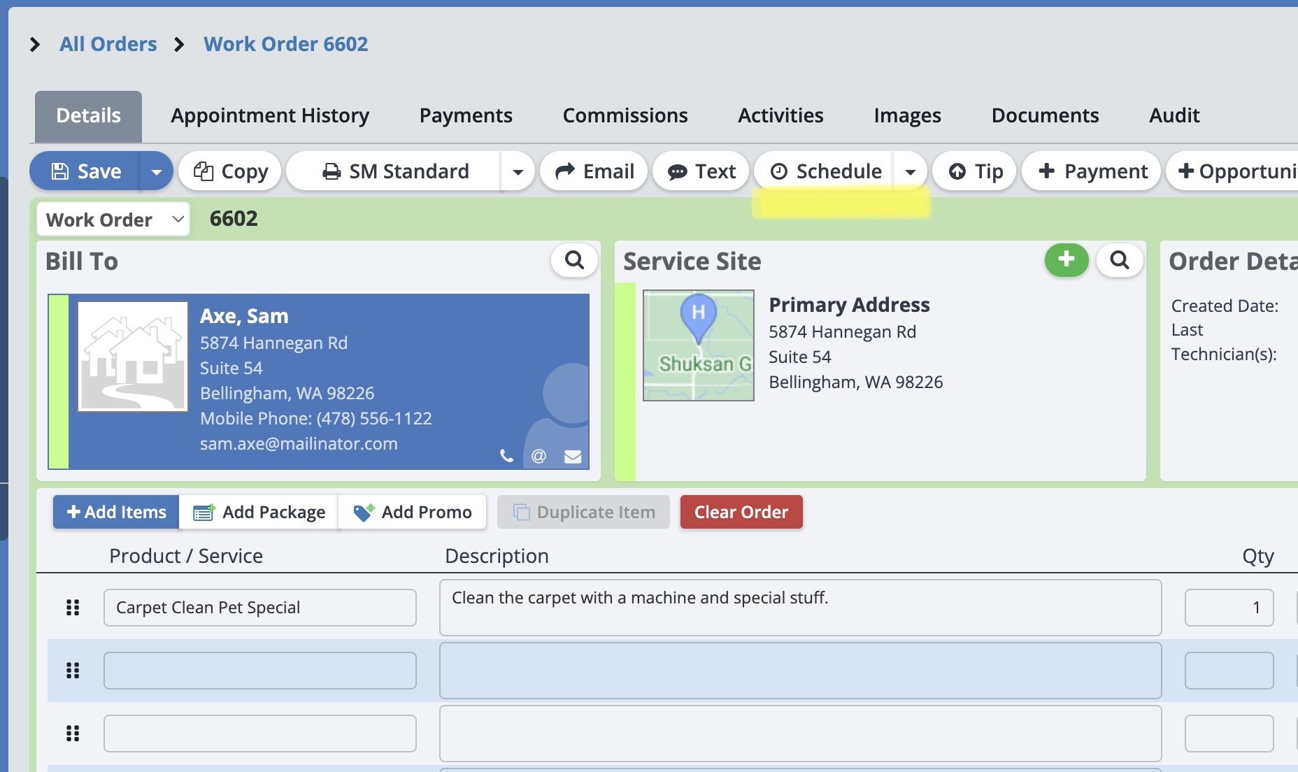 To schedule an appointment from an Order Page (Estimate, Work Order, or Invoice), simply click on the "Schedule" button in the menu bar.