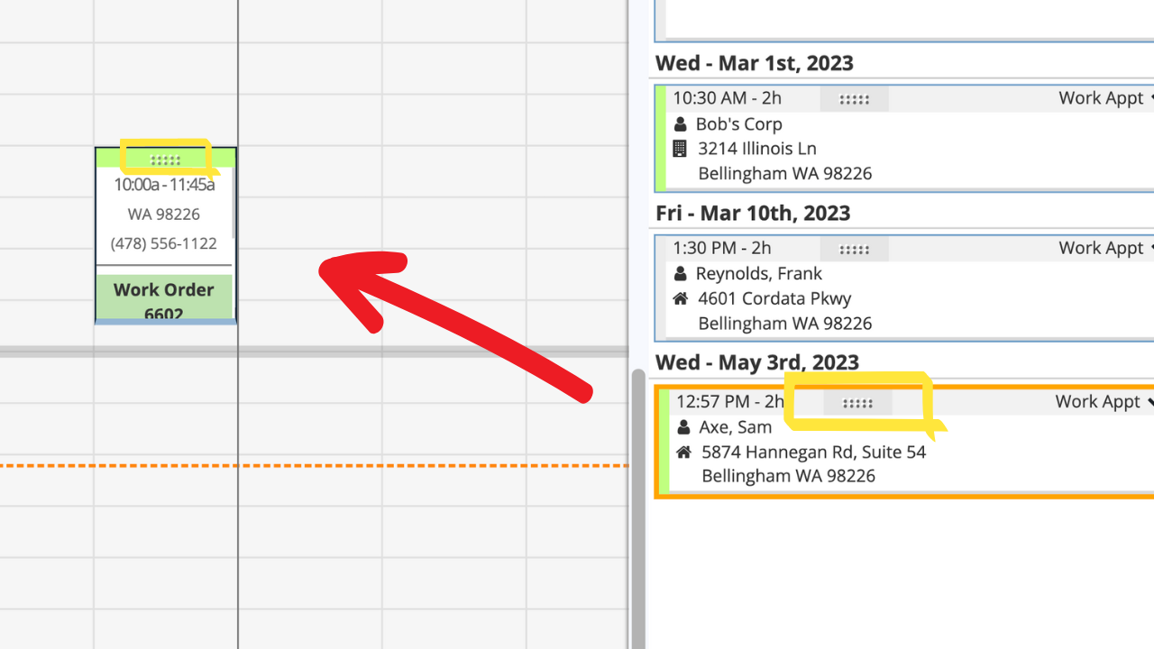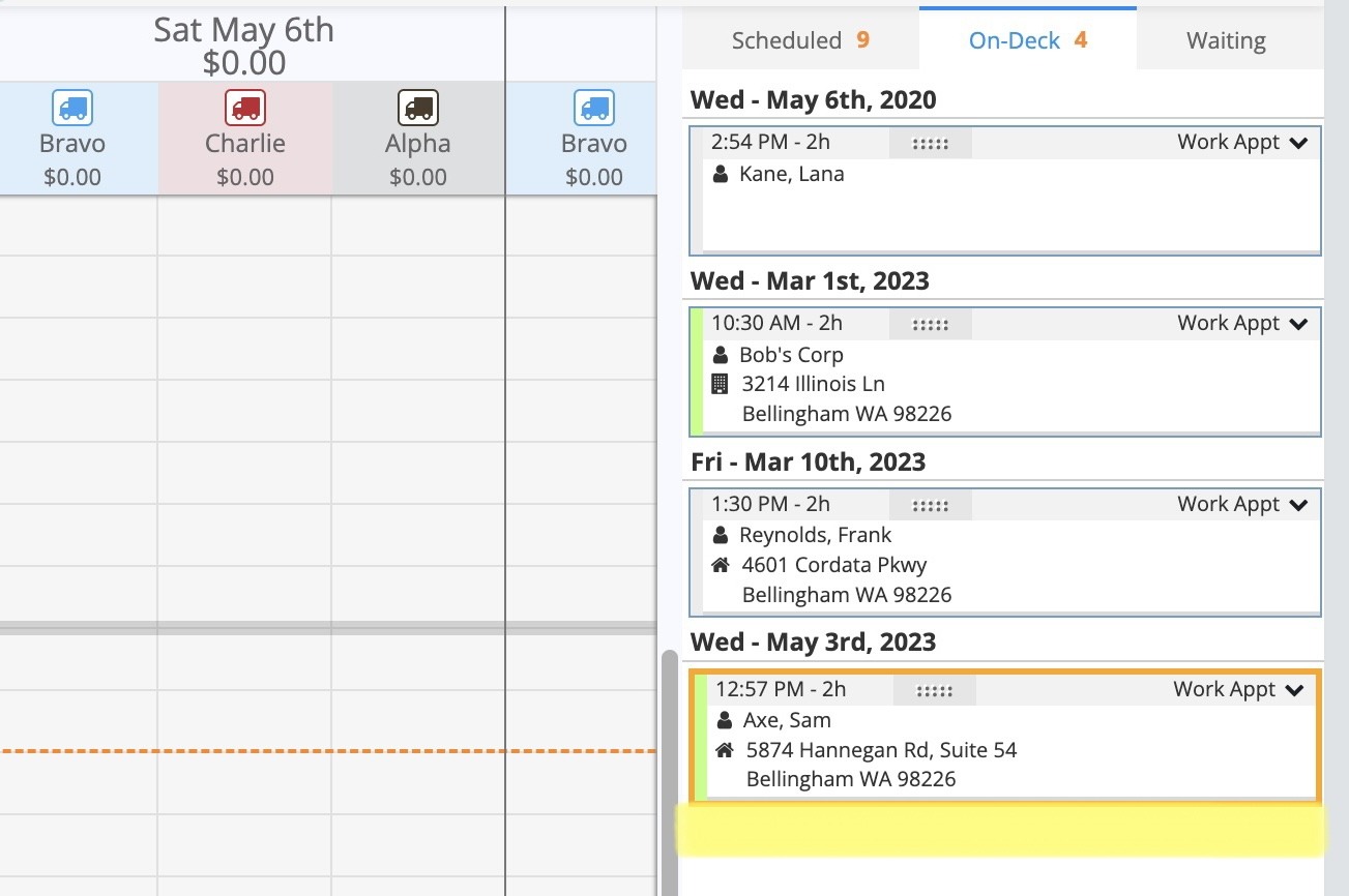 To add it to the Schedule, simply drag and drop the appointment from On-Deck onto the schedule. You can drag the appointment by clicking on the dotted grab area.