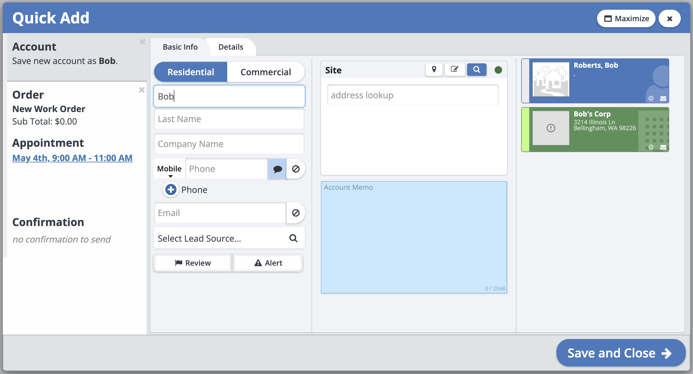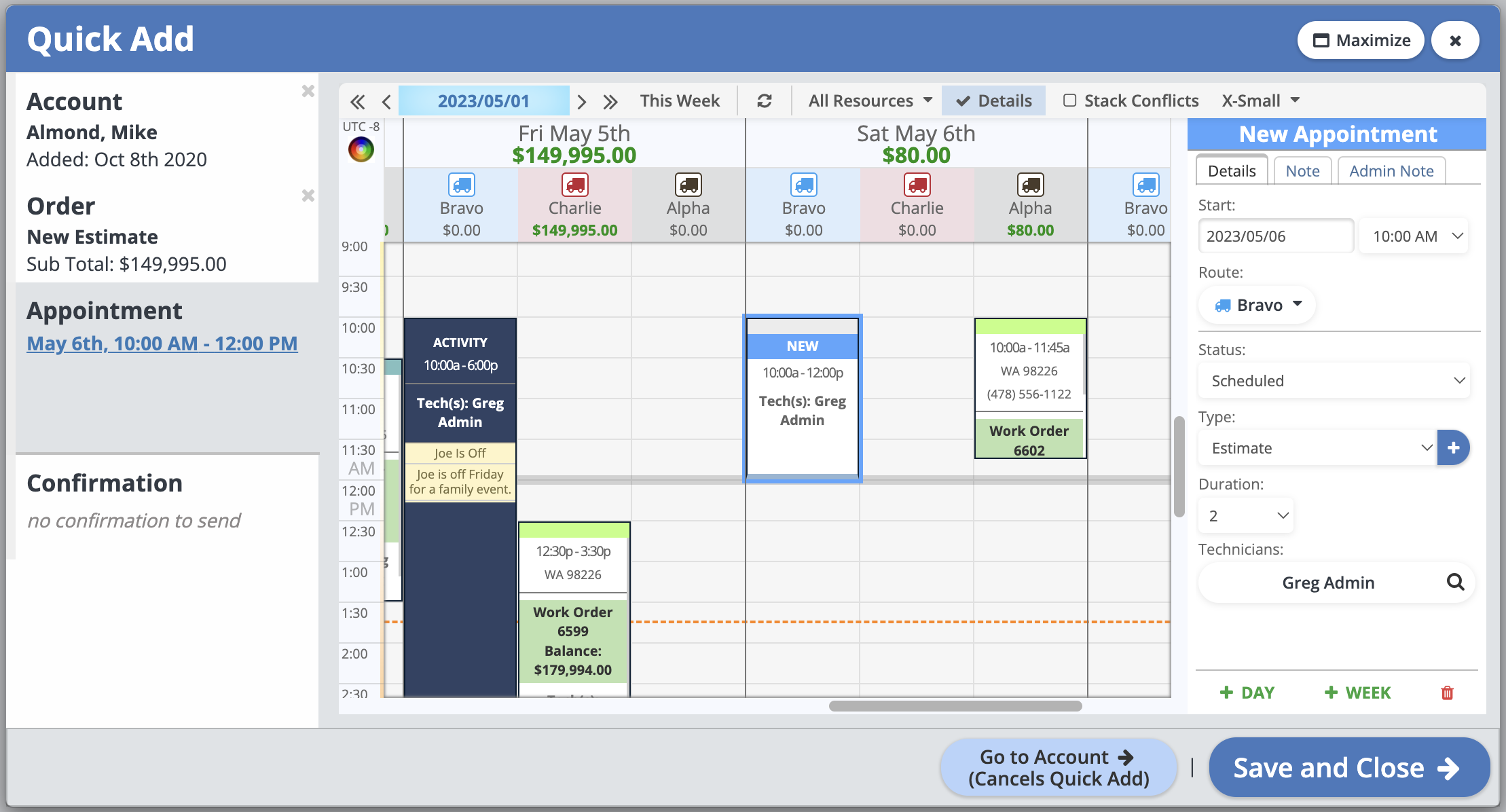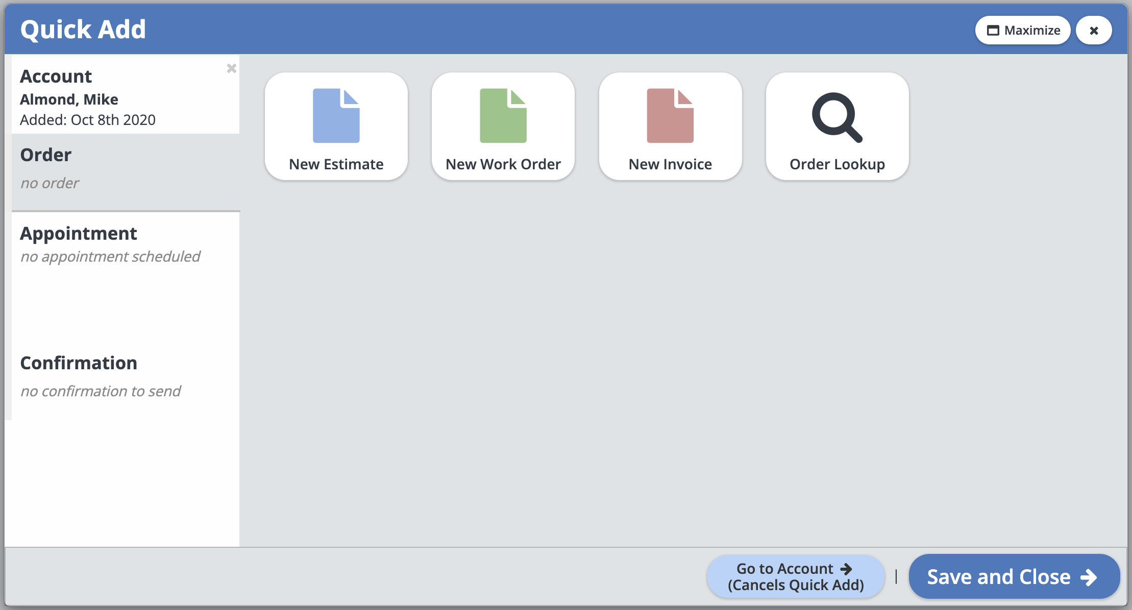 Then the Quick Add will open up with the appointment already created, so simply create or add the account and order information.