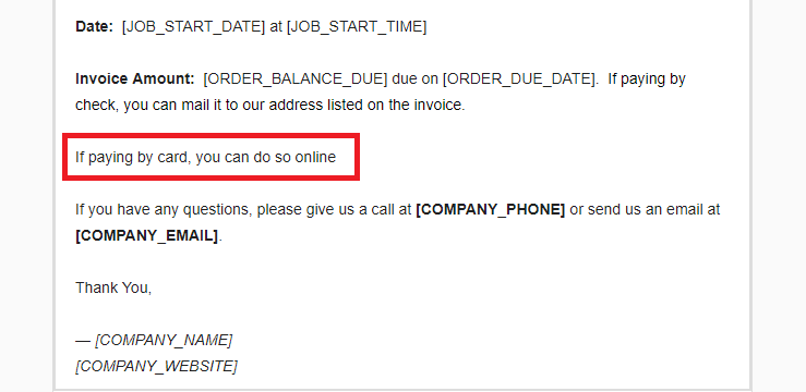 or copy (Ctrl + C) this messaging from here into your template: Thank you for your business, [FIRST_NAME]. Click on the link below to view and pay for your invoice.[PAYMENT_LINK_SMS]
