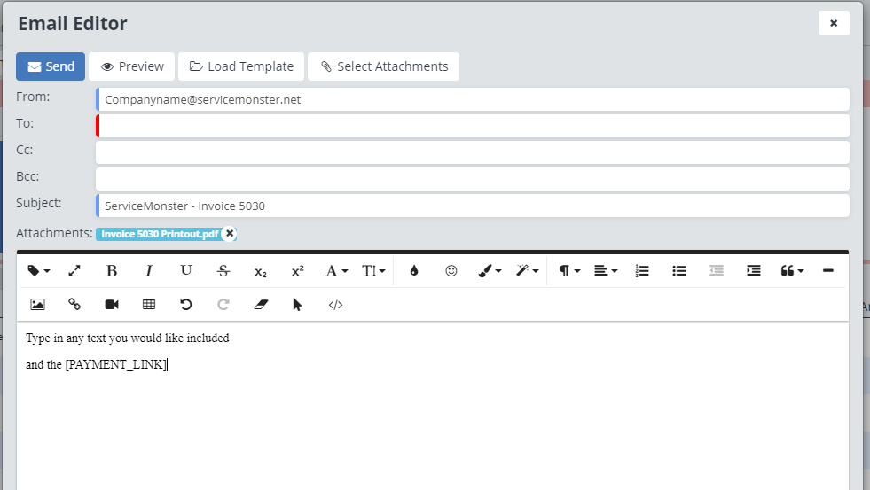 Add in any text you would like there to be included in the email, as well as the payment link merge field.