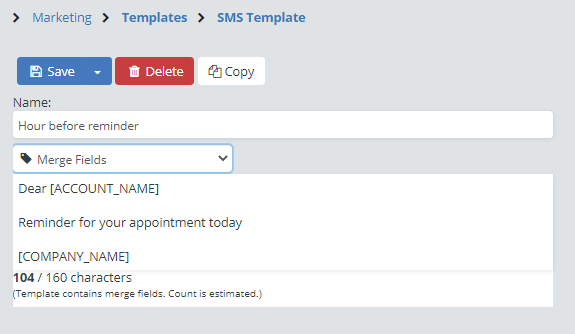 Select SMS Templates Tab, then click the "+SMS Template" Button (or edit an existing template).