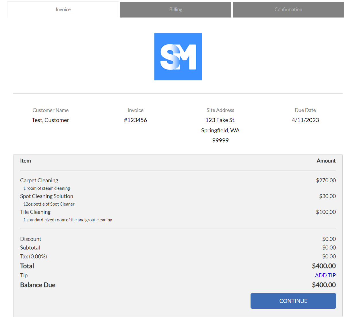 When the customer receives the email, they are able to click a link that will take them to a page showing them their invoice, which will include any discounts and tax, if applicable. They will have the option to add a tip. They can enter their billing information and submit payment.