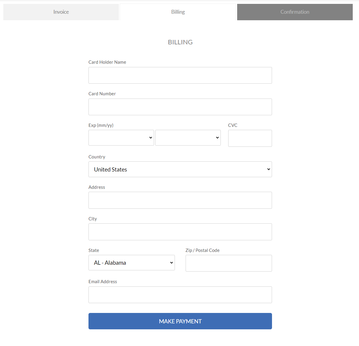 The merge field will send a link that says ‘Click here to make a payment’ to the customer with their invoice information, and a page for them to fill out their credit card and billing info.