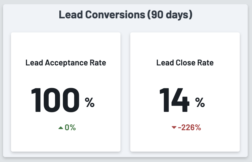 Larger Number shows % of your leads that were accepted Hovering over number shows count of leadsSmaller number below shows growth (green) or decline (red) from previous period