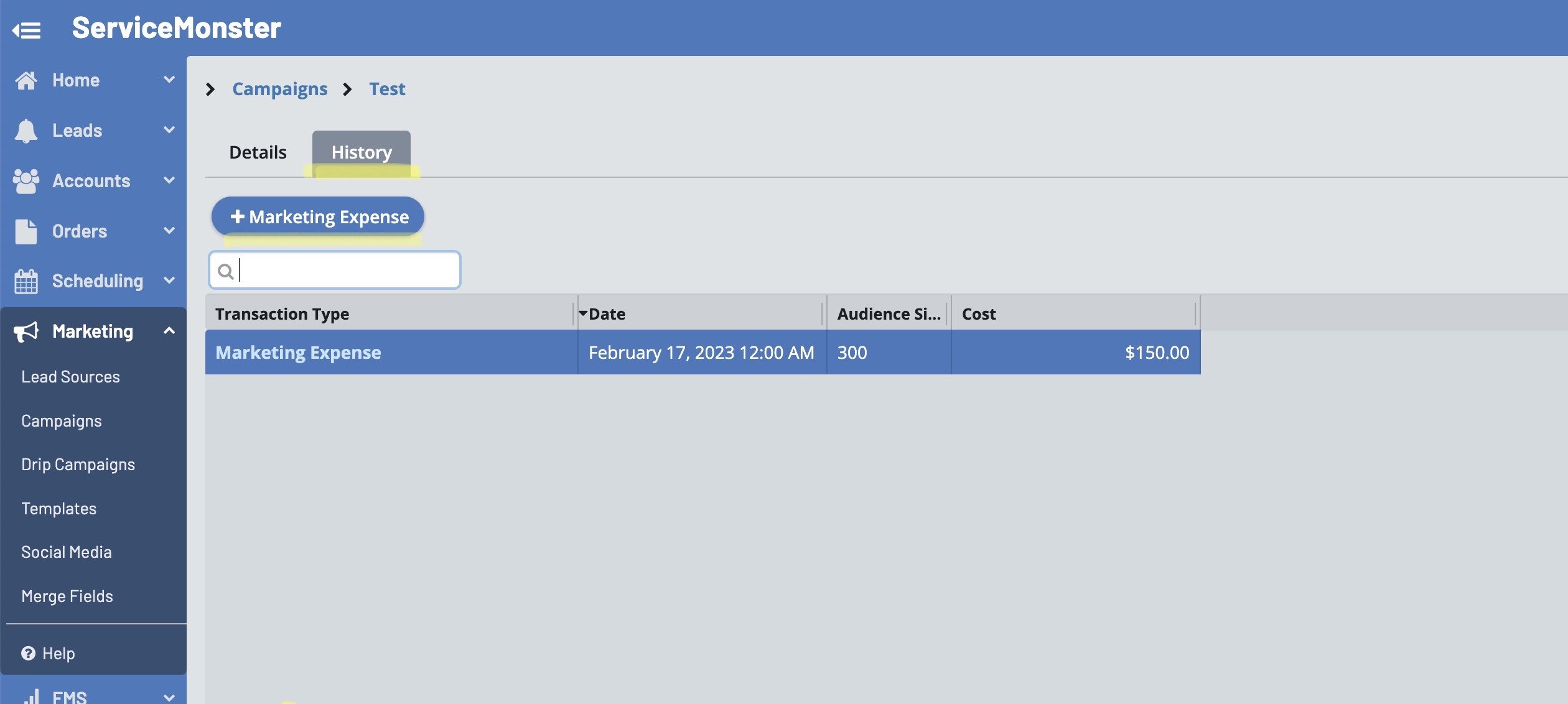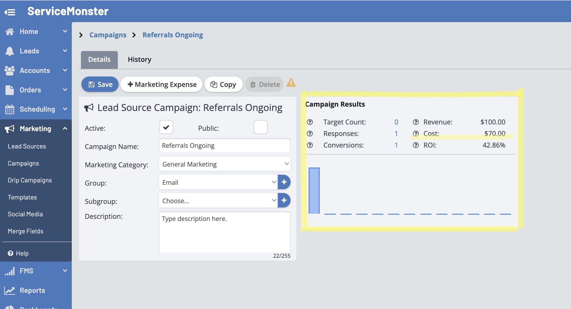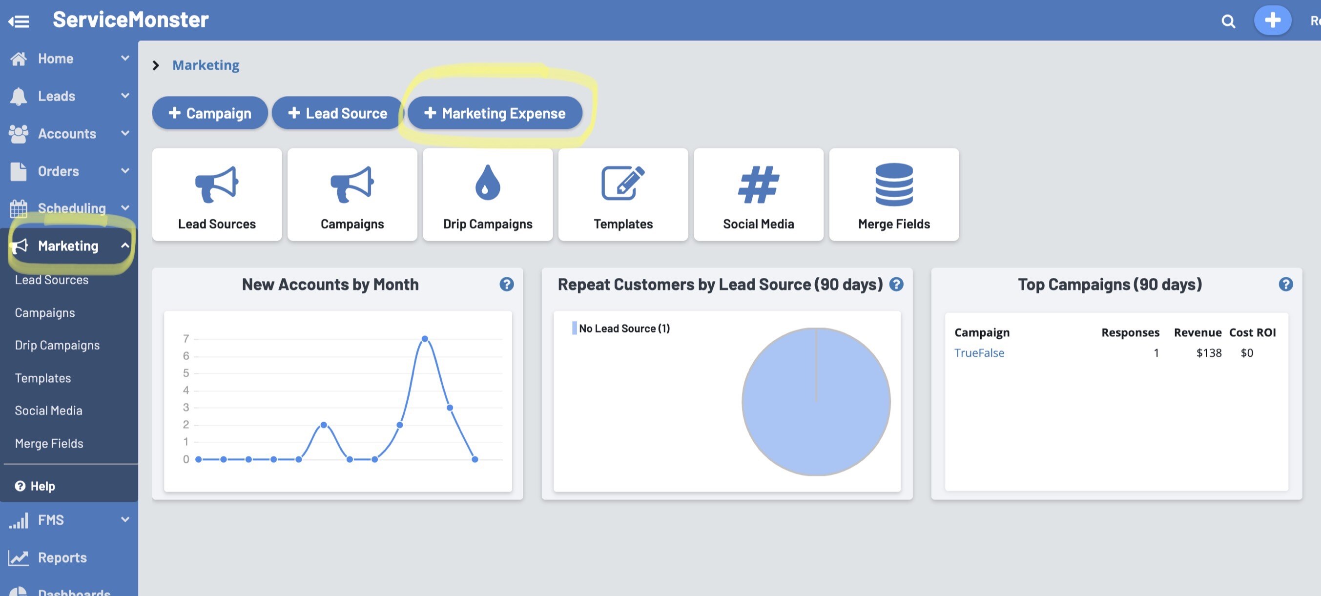 Marketing Expenses are the costs incurred from your advertising, agency fees, customer surveys, etc. Tracking marketing expenses allows you to calculate your ROI over time for various campaigns, in ServiceMonster or not.