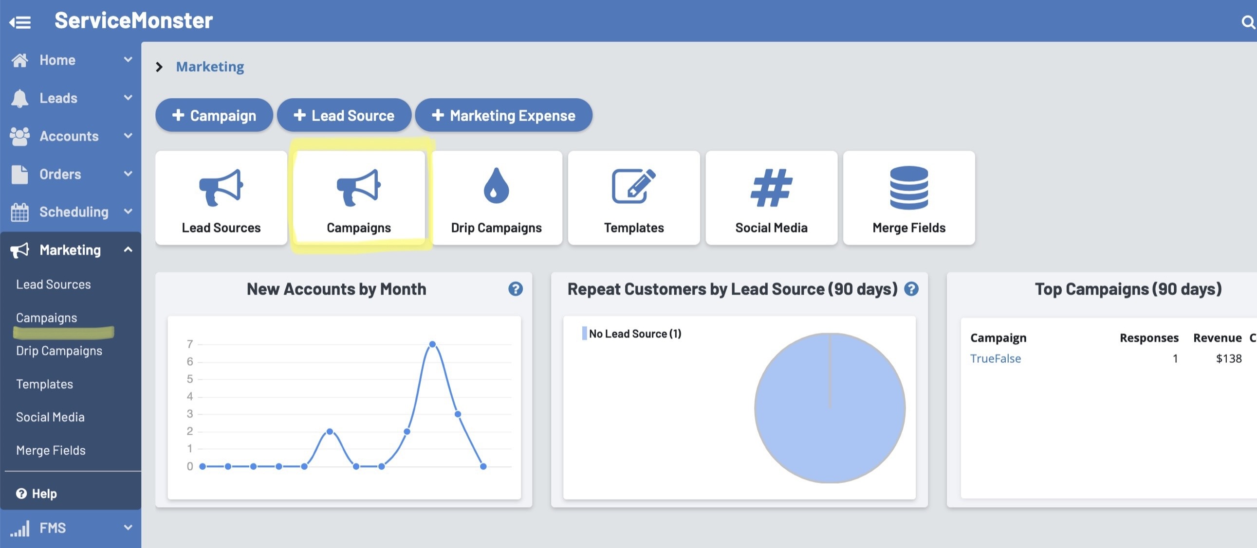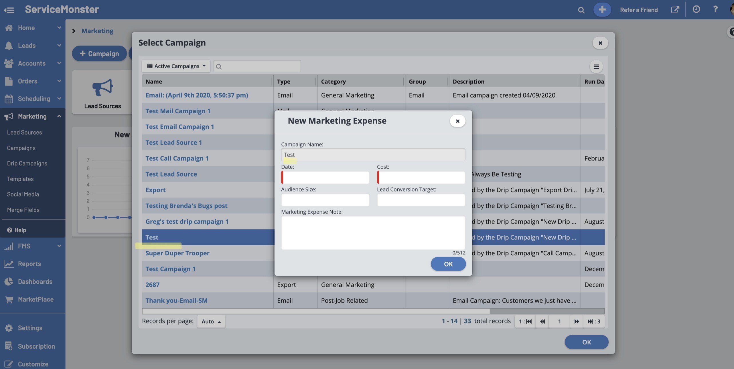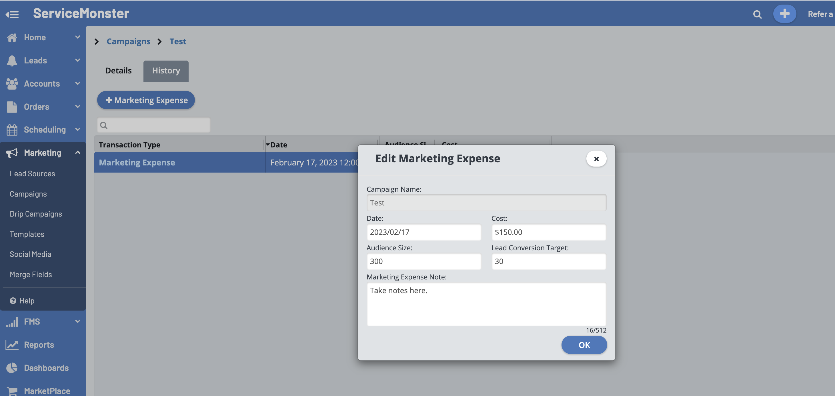 Marketing Expenses are the costs incurred from your advertising, agency fees, customer surveys, etc. Tracking marketing expenses allows you to calculate your ROI over time for various campaigns, in ServiceMonster or not.
