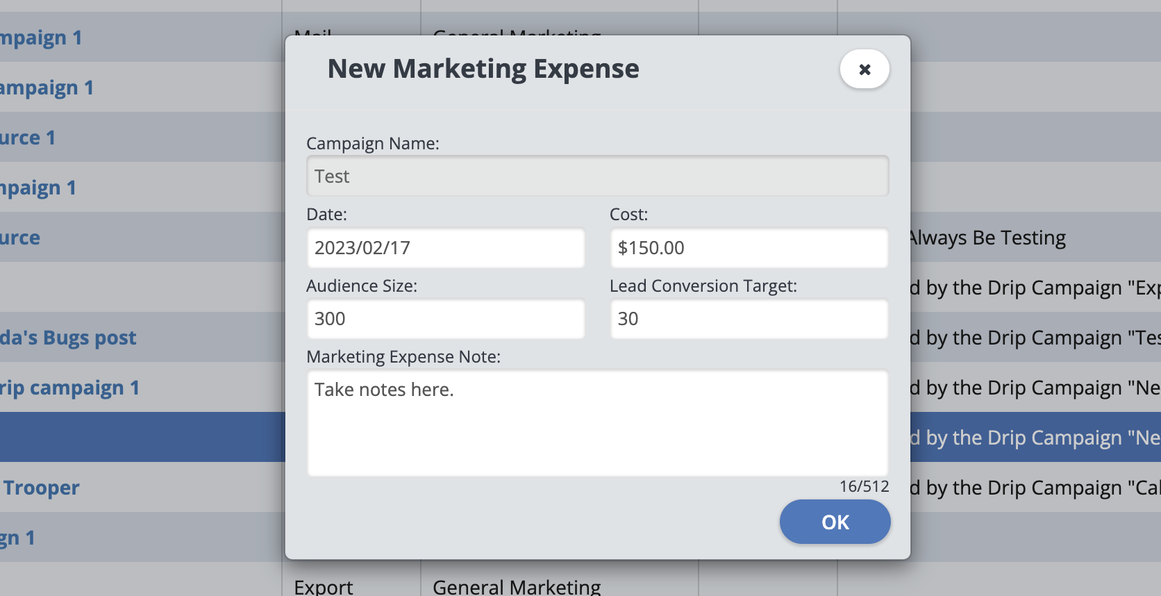 In this "New Marketing Expense" window, you can fill out the date of the expense, the cost, the audience size (approx. how many people were reached by this campaign), your lead conversion target (how many people from that audience you expect to convert), and any marketing expense notes you wish to take. The fields marked in red are required fields and must be filled in to continue. Click "OK" to save and close when finished.