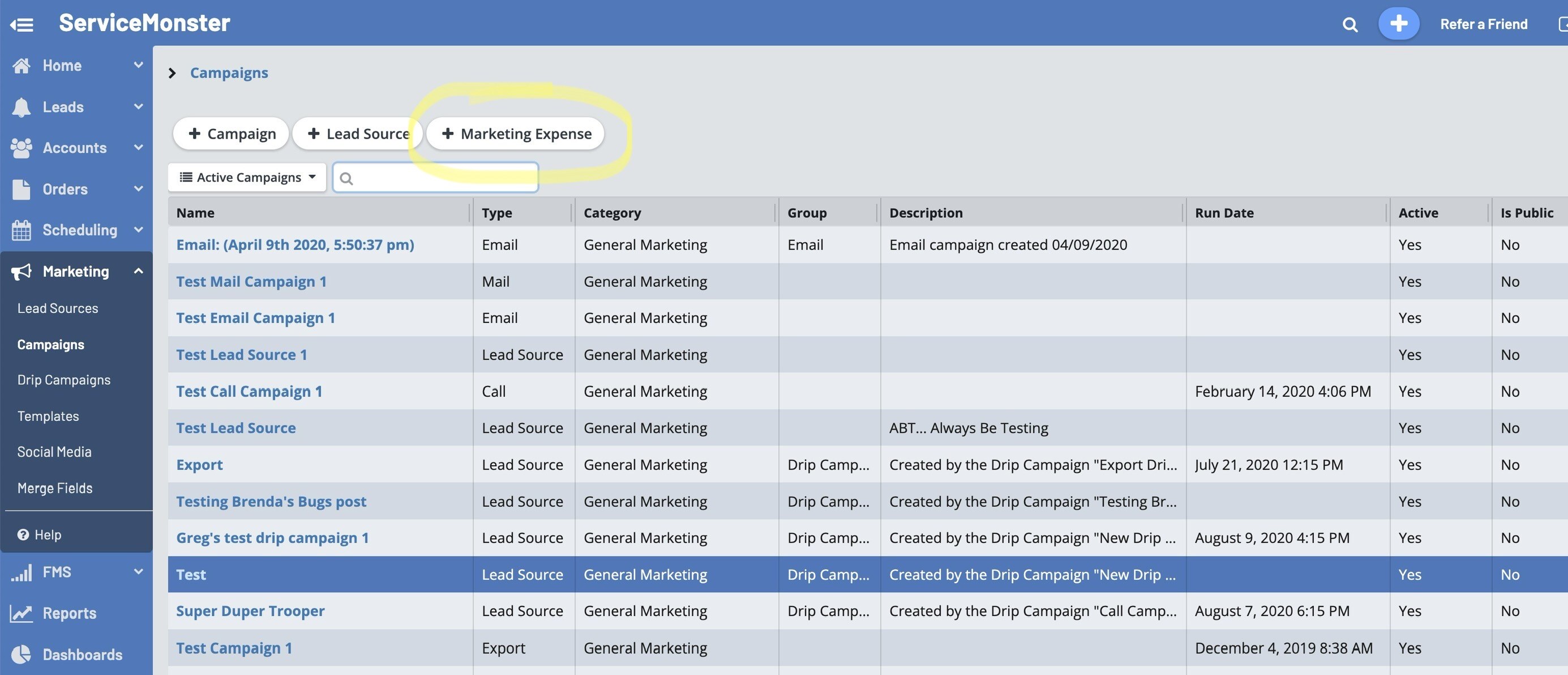 If you click on the "Campaigns" button within the Marketing tab, a list of campaigns will appear.