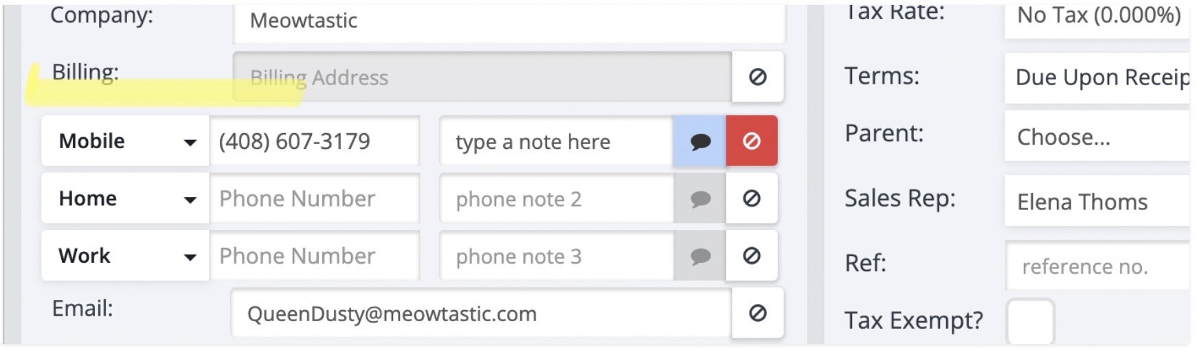 Below you can see the texting icon is turned on in blue, and the "do not call" icon is turned off in red. This indicates that yes, you may text this number but please do not call. You can come back and change this at any time. If you wish to turn off Marketing by mail, you may do so by clicking the circle with the line through it besides "Billing". This button will turn red, indicating do not mail. When finished, please remember to click "Save" in the upper left to save your changes.