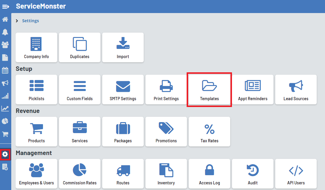 To add a Merge Field into an SMS template, simply click on Settings and then Templates.