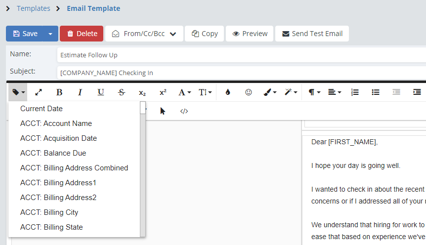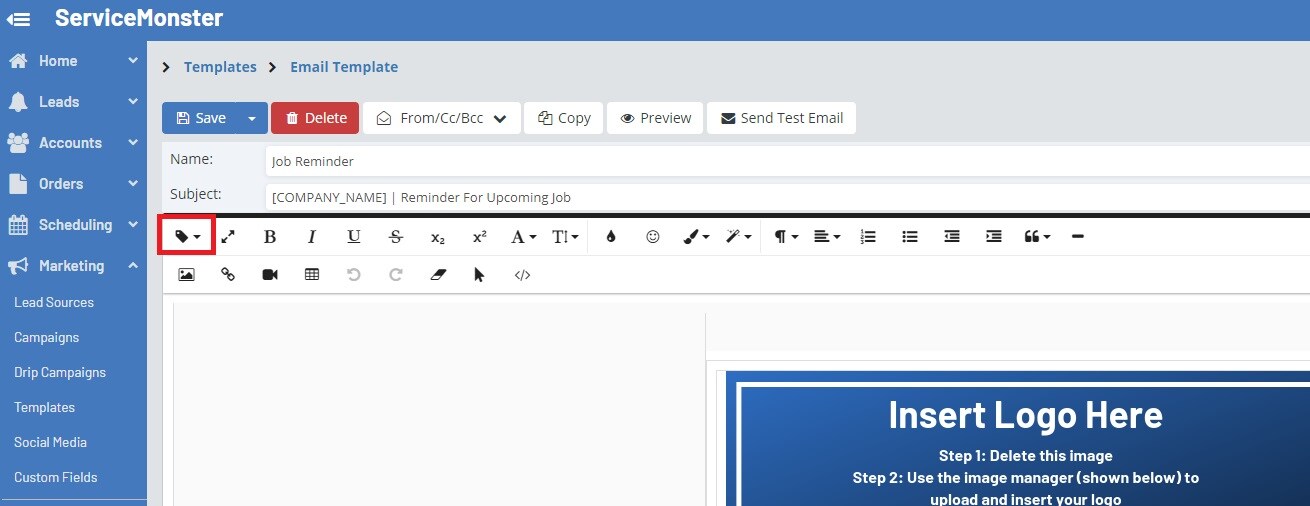 Merge Fields are a great tool you can use for Email, Marketing, and SMS templates to let ServiceMonster do some of your work for you! If you ever see words surrounded by brackets on a template, for example [NAME_FIRST] that's a Merge Field!