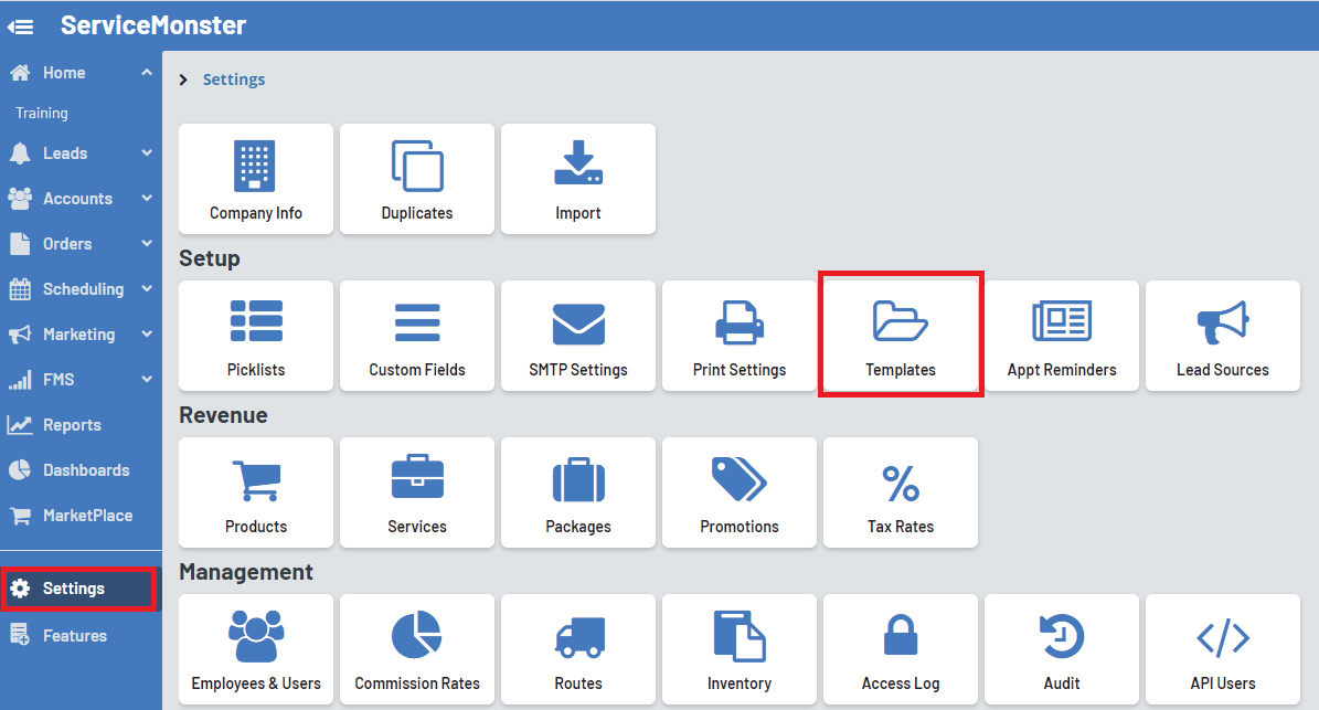 To add a Merge Field into a Marketing Template, simply click on Marketing and then Templates.