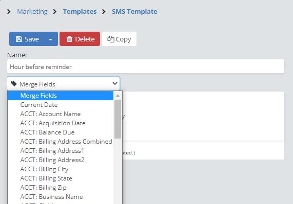 Note: Different Merge Fields are available on Email, SMS, and Marketing templates.