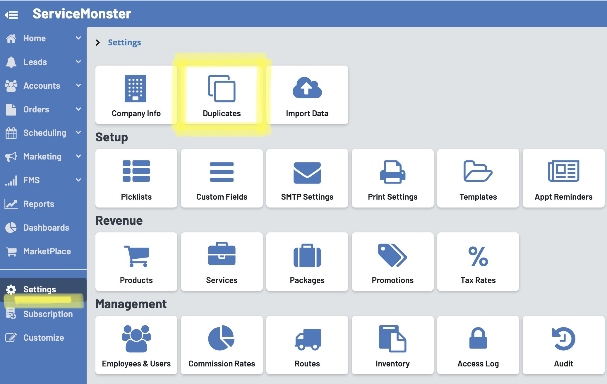 From "Settings" in the Main Menu, select the "Duplicates" icon (Grow and Premier plans).