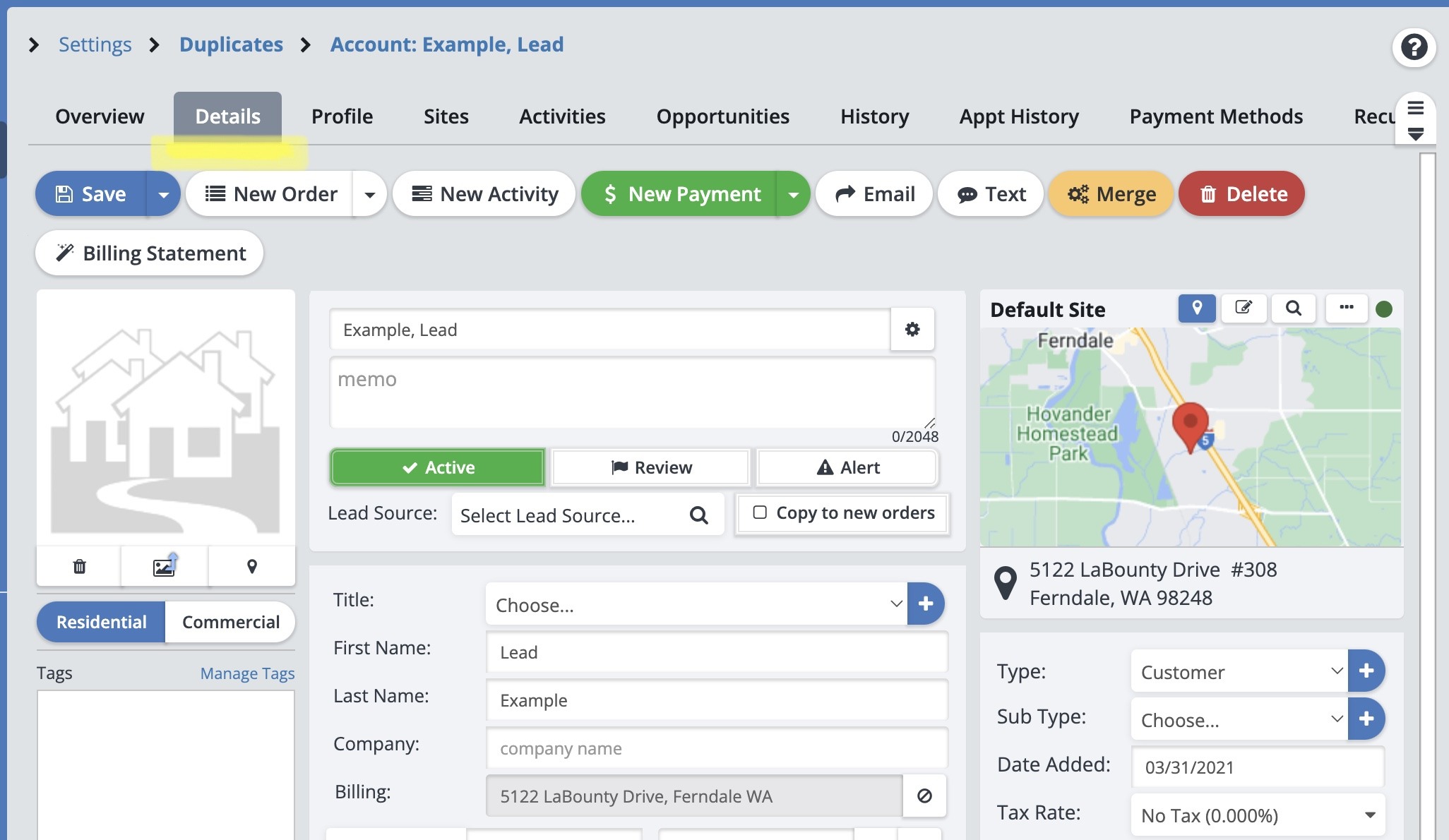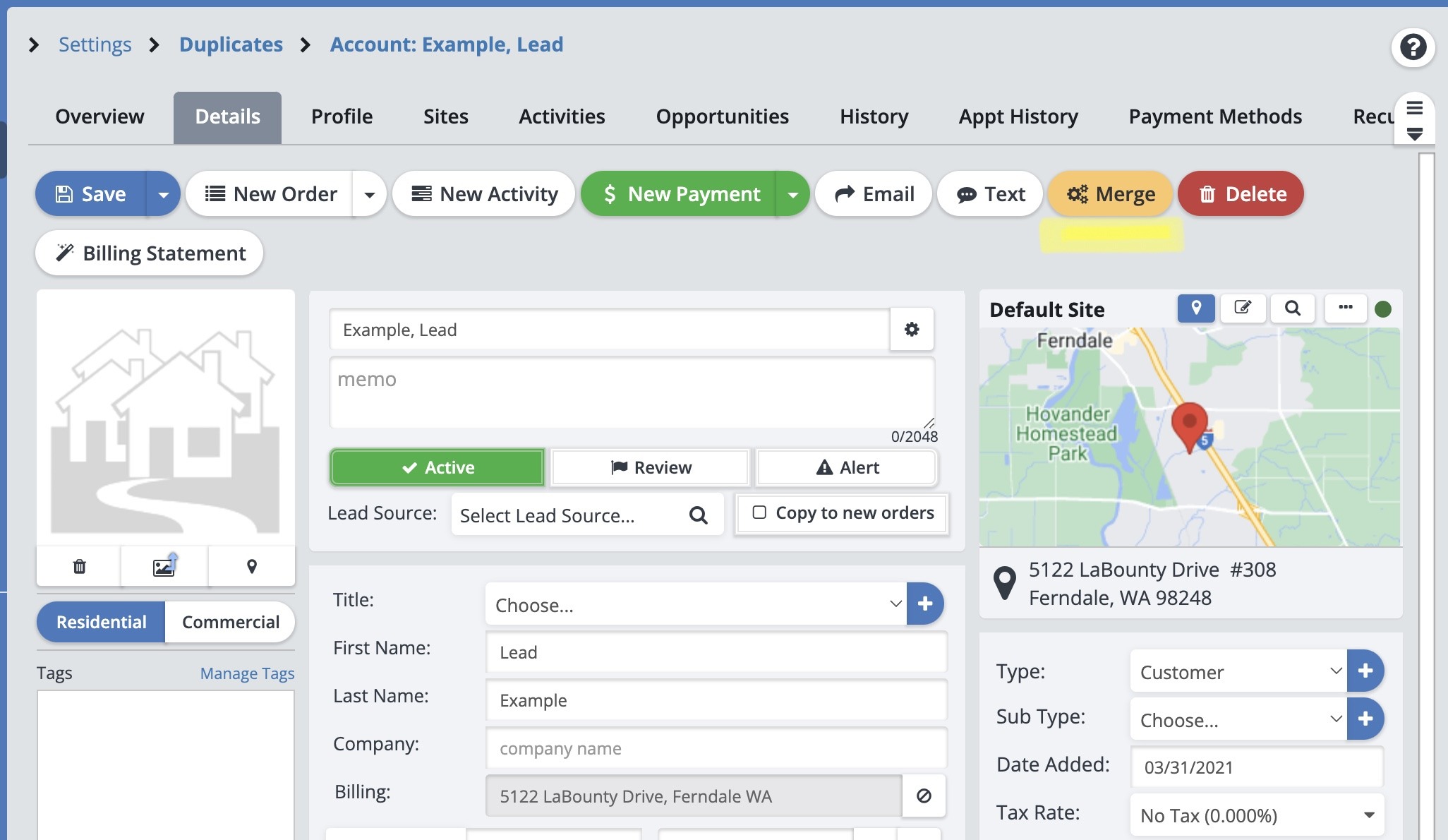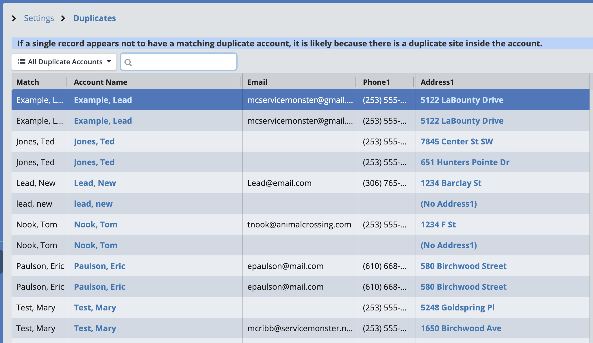 Duplicate accounts (two or more accounts or leads that are likely the same client) may arise. Because ServiceMonster is built so you can have multiple site addresses attached to one account, we recommend having only one account for each client.