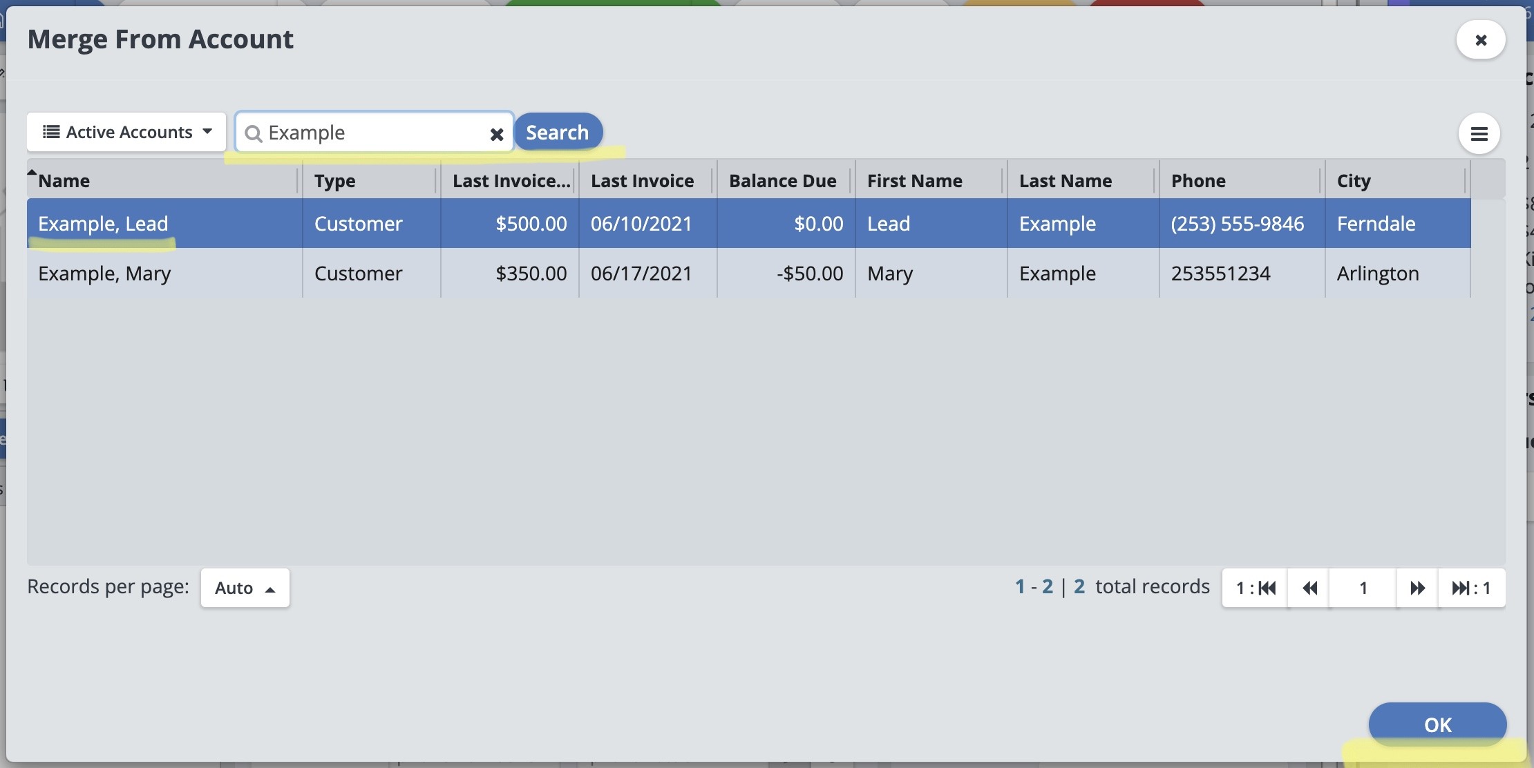 Select the account you want to merge by clicking on it, then select “Ok”.