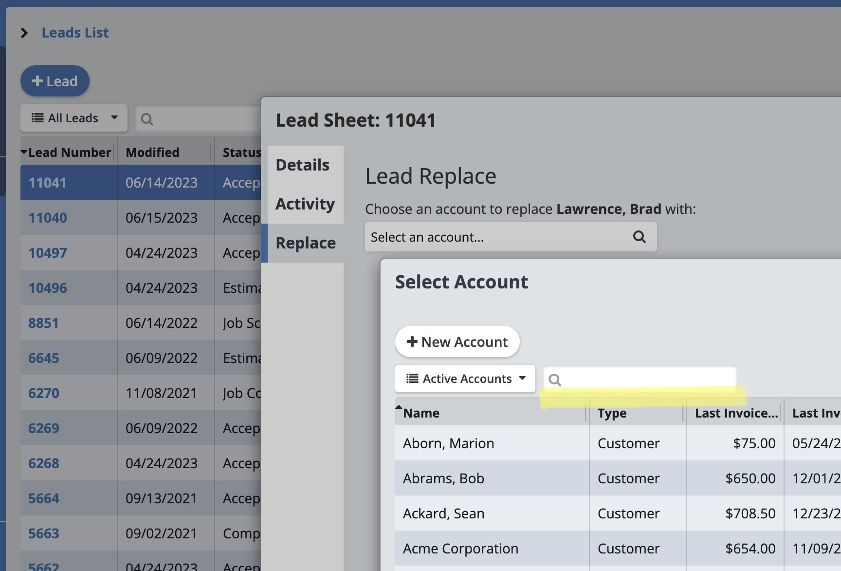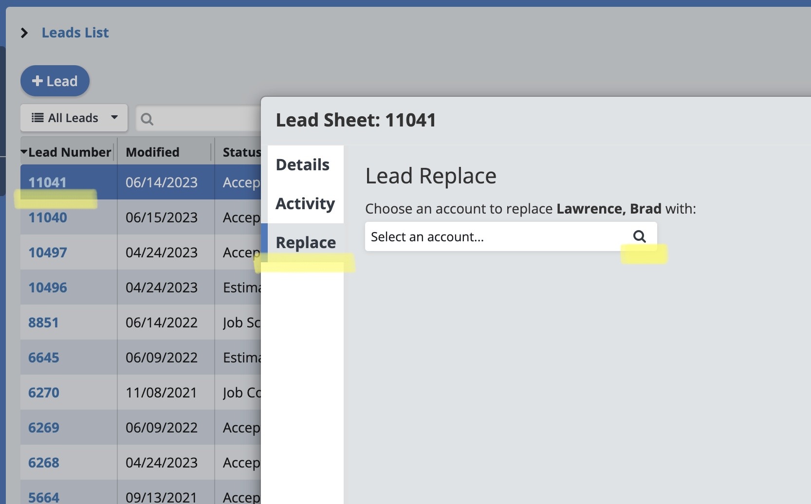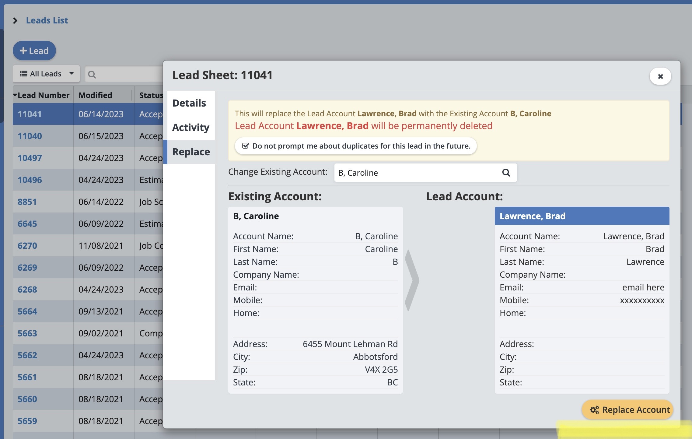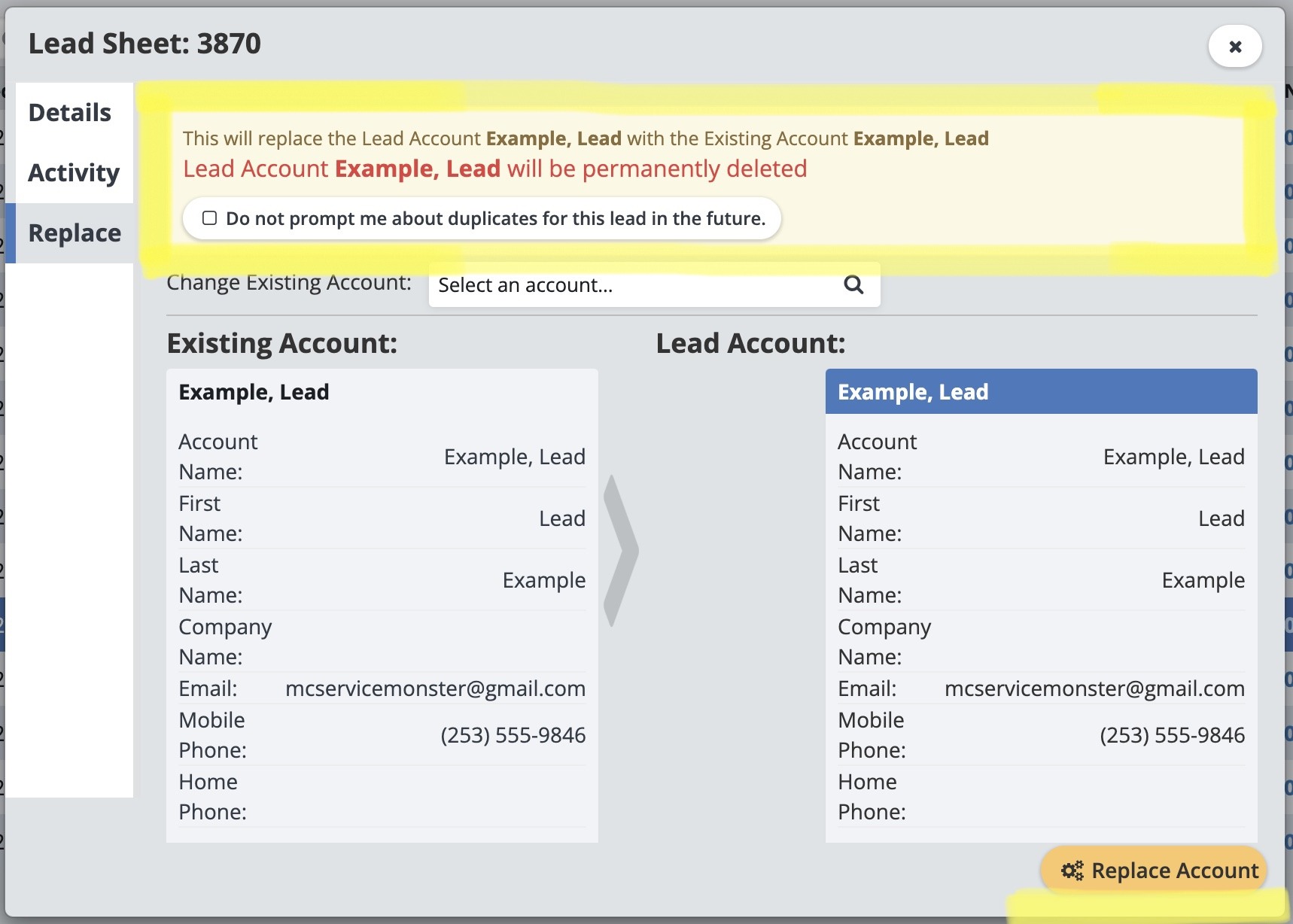 The Lead Sheet will find and prompt you to replace any duplicate Lead Account with the original Existing Account.