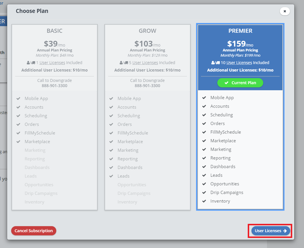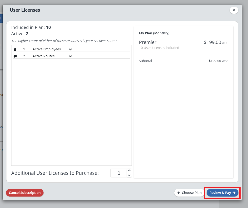 Clicking on the “User Licenses” (next arrow) button will take you to the next page where you can view and adjust the number of user licenses you will need. Every subscription plan now has a default number of user licenses included. If you need more licenses beyond that, you can either upgrade to a higher tier or pay for those licenses individually.