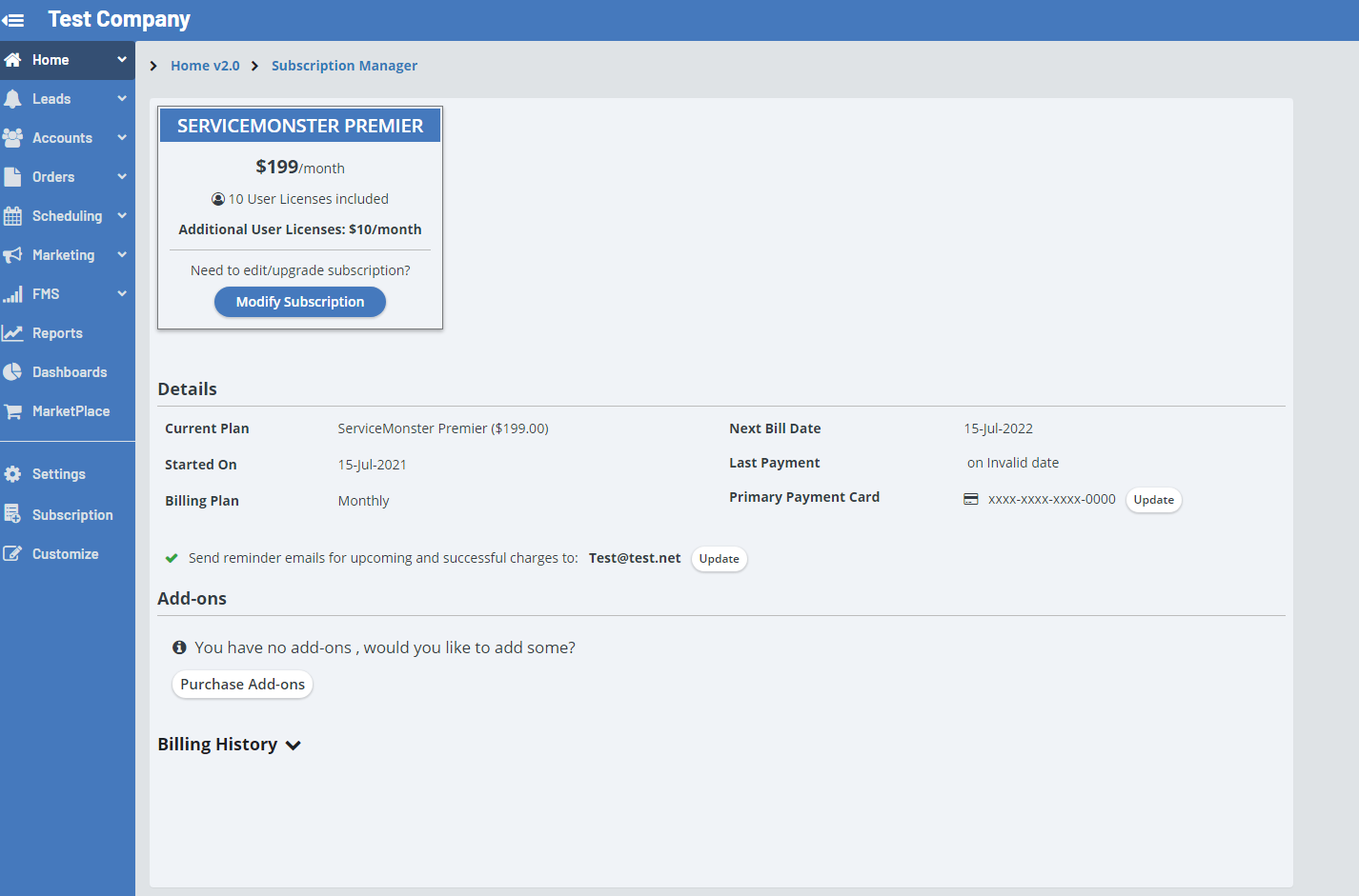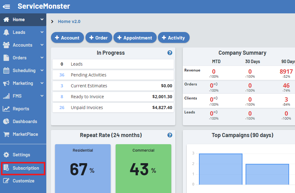 Modifying Your SubscriptionYou can edit or update your ServiceMonster subscription from within ServiceMonster itself. To access your subscription information, click on the “Subscription” link in the left-hand side menu (Note: only admin level users can access this page).