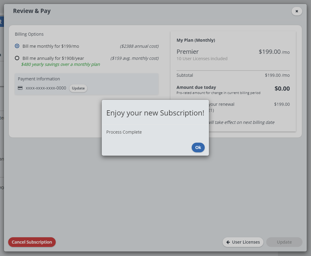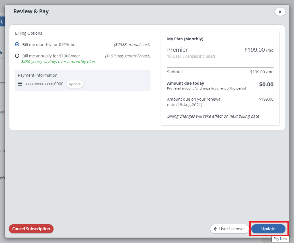 Next , clicking on “Review and Pay” will take you to the final page where you can review your changes, select your billing option, and update your card on file. We now allow users to choose to be billed annually at a discount, or remain month-to-month with the standard pricing. Either way, you’ll be able to see what (if any) charges are due today and then what the recurring charges will amount to, as well as the next billing date. Any upgrades made in the middle of a billing cycle will be prorated.