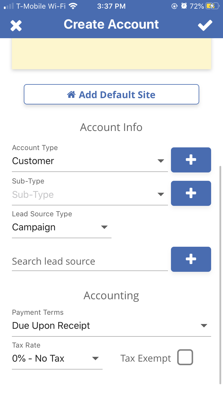 Search Lead Source: Here you can search for the lead source for this account. As you search for options any past lead sources will appear for you to select them. You can also create a new one by clicking on the “+” button.