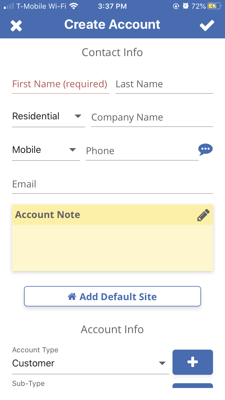 An Account is where you store your client's information within ServiceMonster. You can create both Residential and Commercial Accounts and can have multiple sites on one Account. You will need to create an Account before you can create an Order.