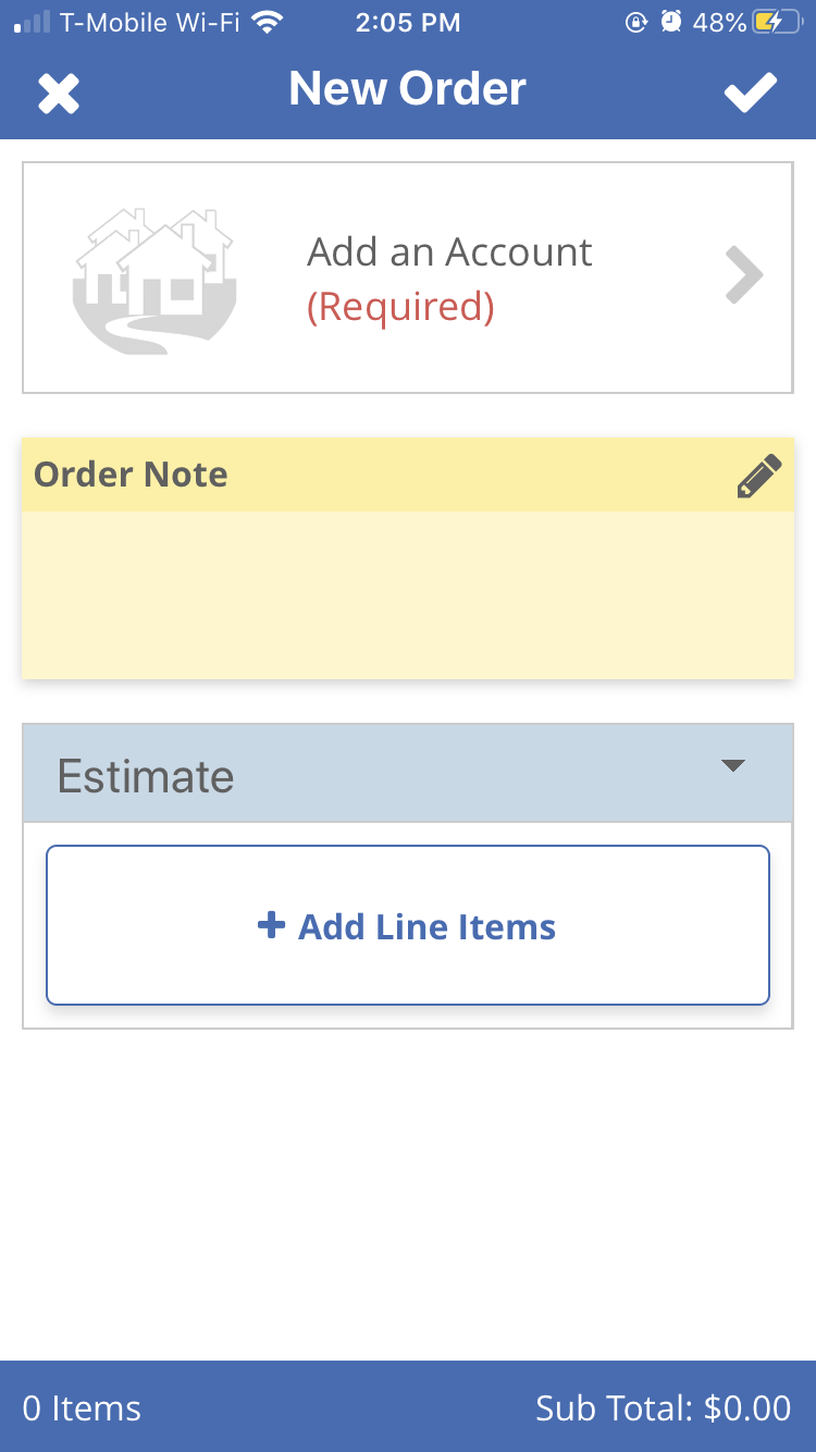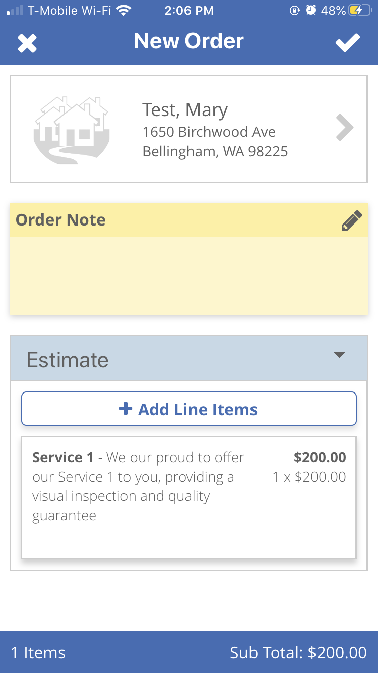 Estimates, always color-coded blue, are the talking step of your process, creating an Estimate is great for clients who are calling around for prices or aren't set yet on doing business with you. If you prepare an Estimate, you will have a record of the prices you offer them and can keep track of your Estimates list, easily contacting those you haven't heard from yet to turn it into a Work Order and get that work scheduled.