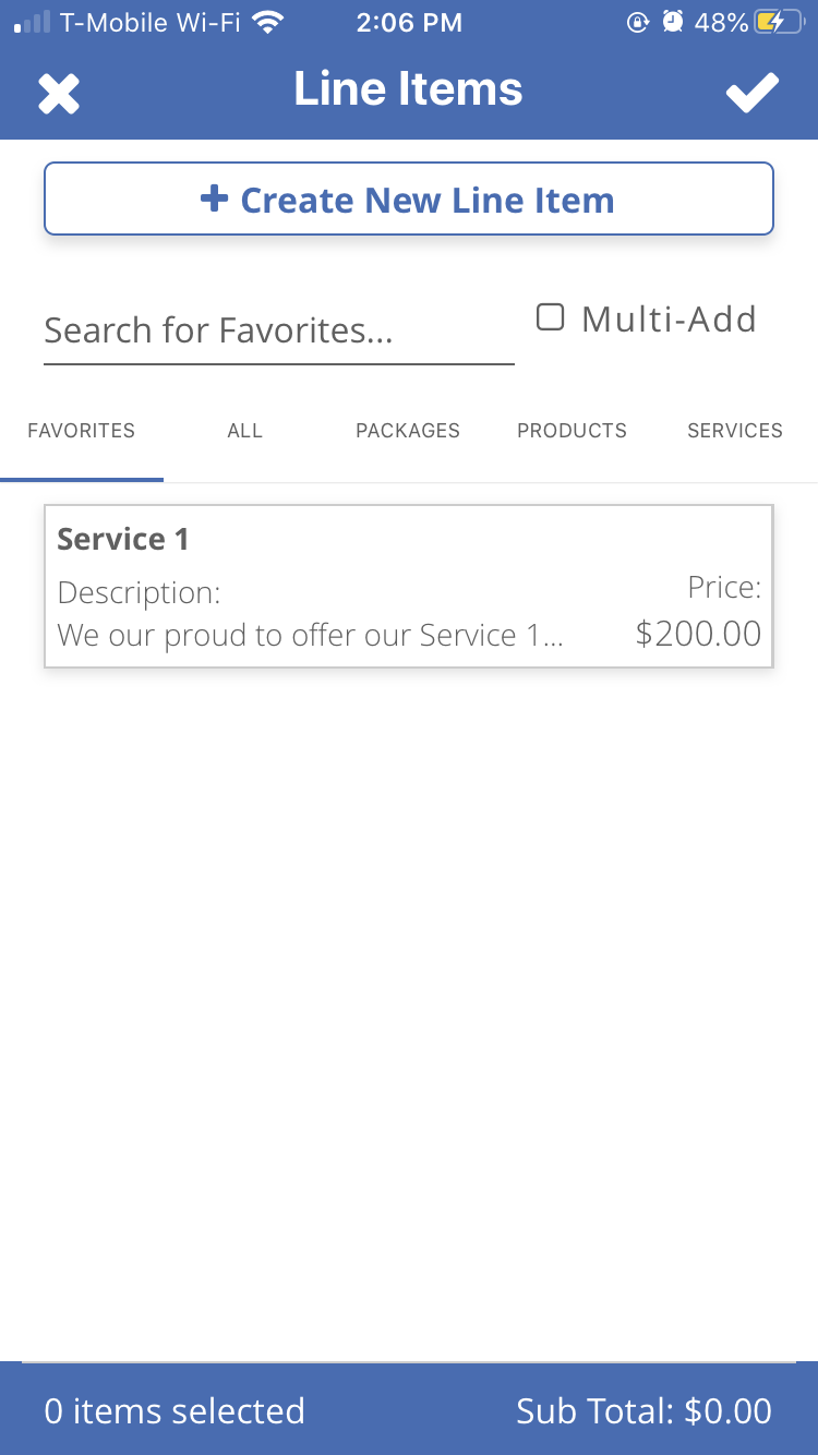 Here you can search for your products and services, or use a package. Clicking on the “+ Create New Line Item” button allows you to create a new product or service.