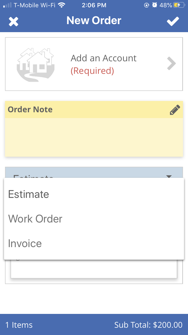Use the drop-down menu to pick if you are creating an estimate, work order, or invoice.