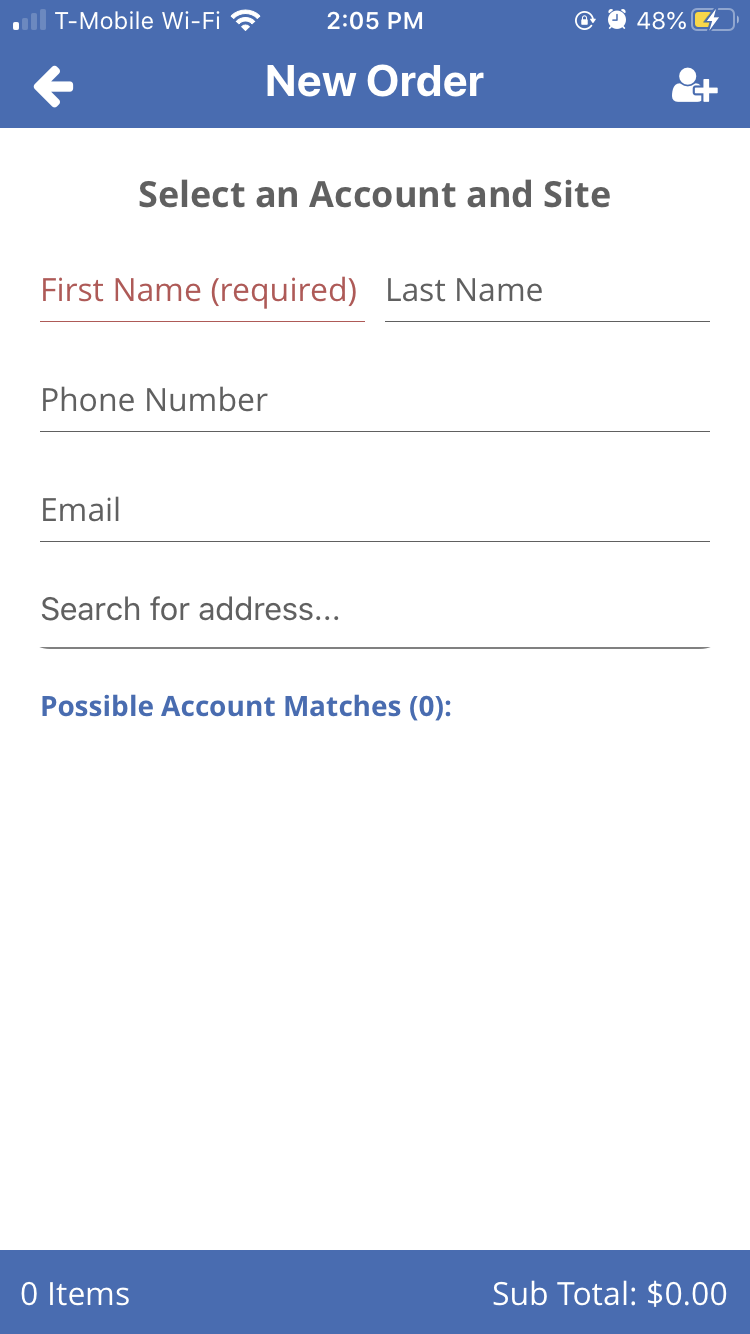 Here you can start typing in the details for the account, any possible matches will appear below. Click on the account you want to use when you see it in the possible matches. You can also create a new account here by clicking on the button in the upper right-hand corner of the screen (To learn more about making a new account on mobile click here).