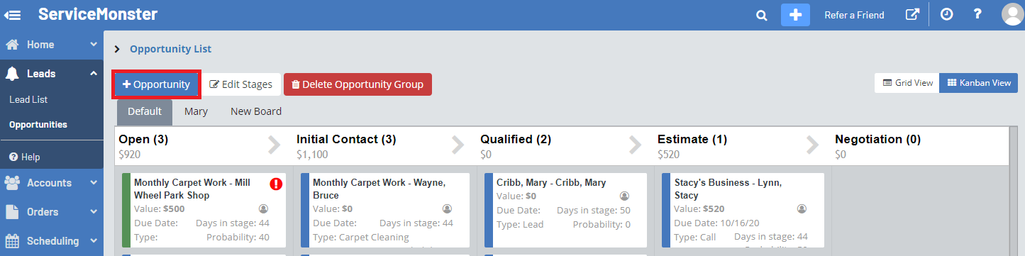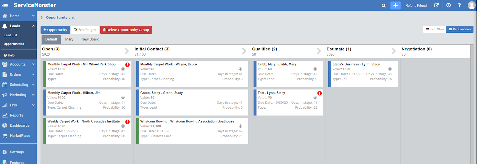 Opportunities are a way of keeping track of your clients, how you communicate with them, and the estimate process. A Kanban is a Japanese style of organization that allows visual tracking of progress.