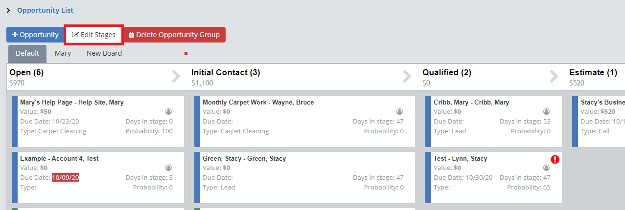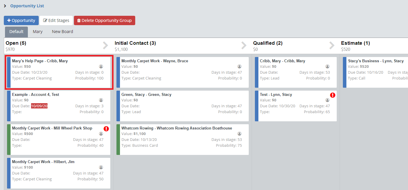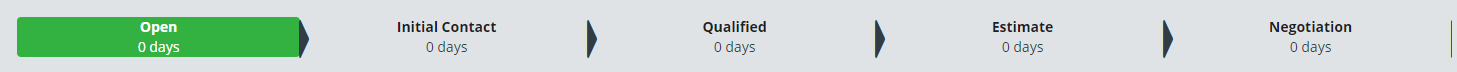Each of the cards on this board is an opportunity. The default Kanban board is built with the following steps: Open, Initial Contact, Qualified, Estimate, Negotiation.