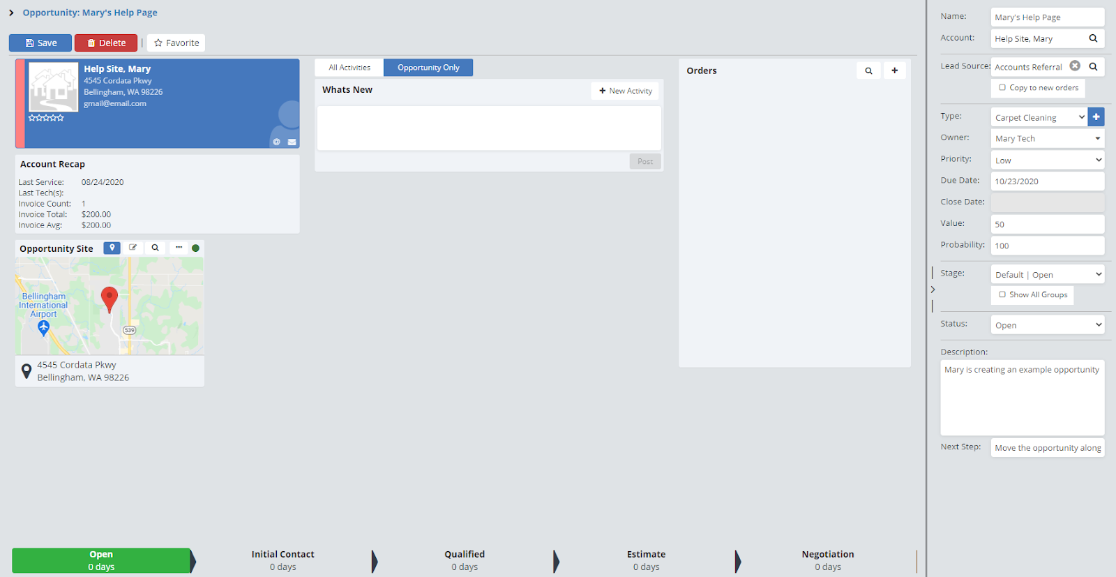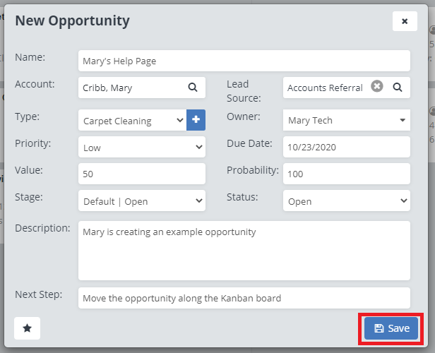 Status: Select between “Open”, “Won”, “Lost”, or “Abandoned”. You can change this as you work with this opportunity, just keep in mind that if it’s status is not “Open” then it will not appear on the Kanban board.