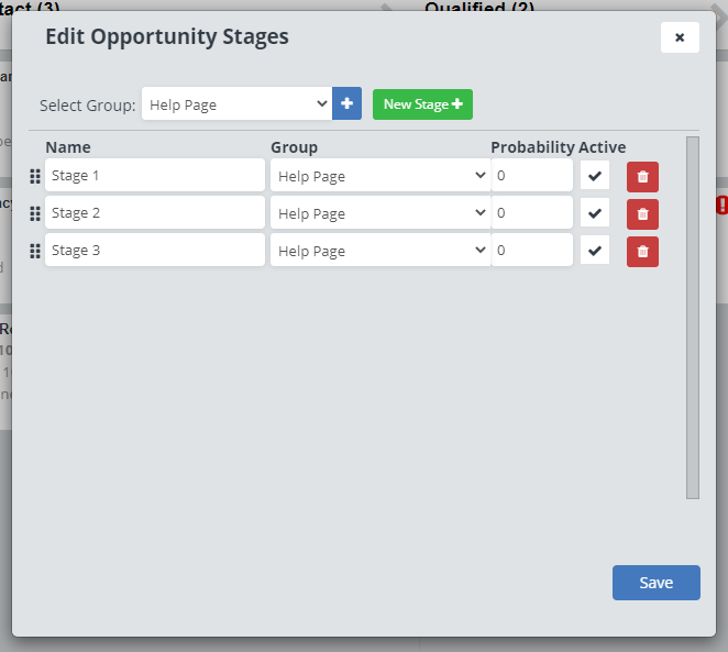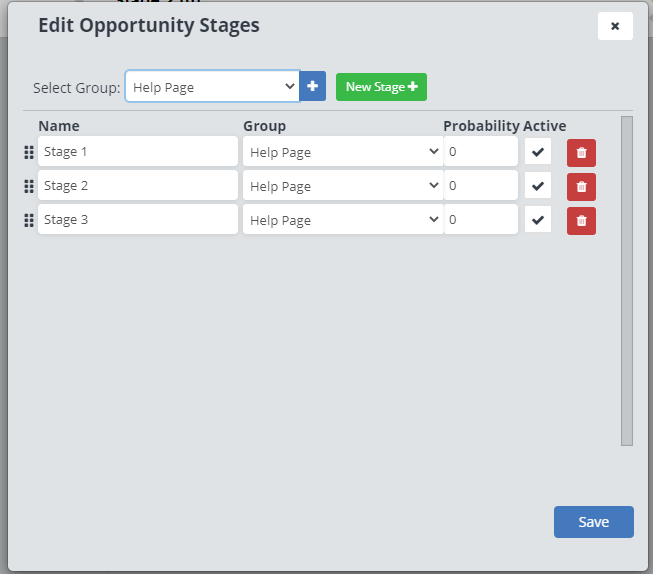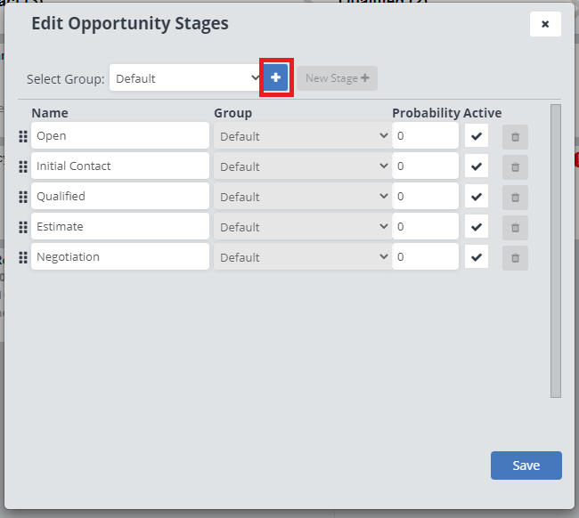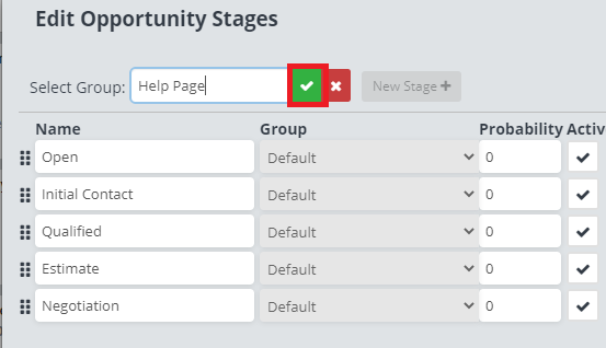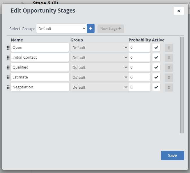 Here you can give the stage a name, you can change what group it’s assigned to, and you can mark what the probability of an opportunity getting to that stage will be.